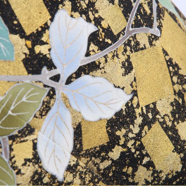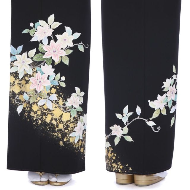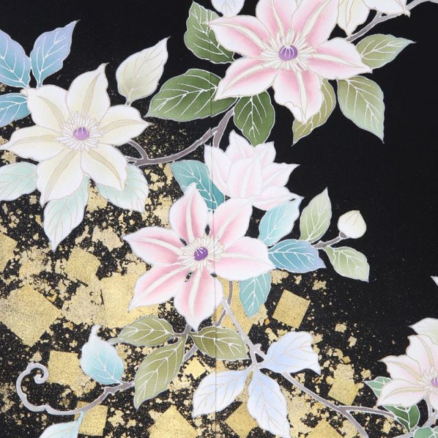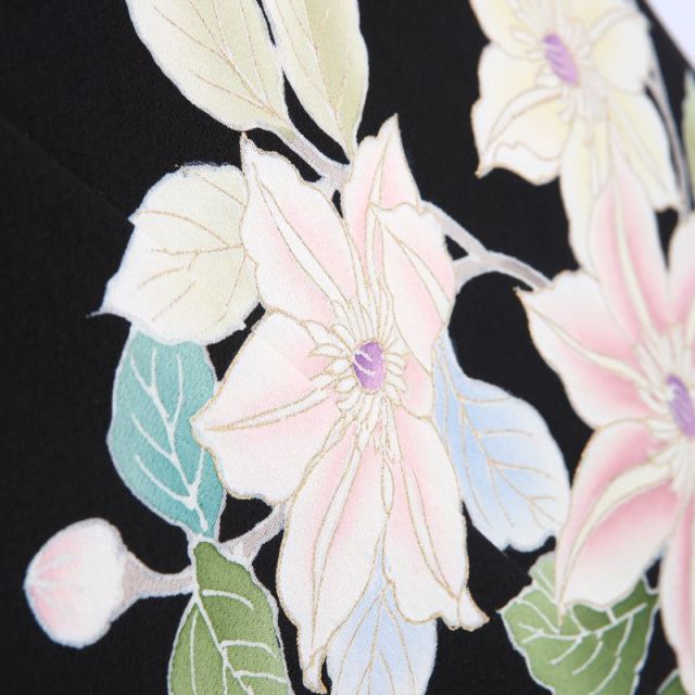 手描き友禅作家『宮崎玄祥』が手掛ける留袖は、スタイリッシュかつ落ち着いた絵柄でシンプル・ハイセンスなものを好む方々から定評があります。ななめに施された金の切箔がまるで夜空に浮かぶ天の川のようです。金のベールが上品で神秘的に輝き、お着物によりいっそうの華やかさをプラスします。寄り添うように描かれているのは美しい“鉄線(クレマチス)”。淡く優しい色合いの鉄線の花ときらびやかな金箔とのコントラストが美しく、お互いを引き立て合っているかのようです。鉄線のような丈夫な蔓(つる)を持つことから鉄線花と名付けられていますが、その名に反して、花は大輪で気品にあふれ非常に優雅なため「夏花の女王」と呼ばれています。5月から6月頃に咲く花ですが涼やかに咲く様子から夏を代表する花とされています。お着物の季節感を大切にされたい方は初夏に着るのがおすすめの一着です。