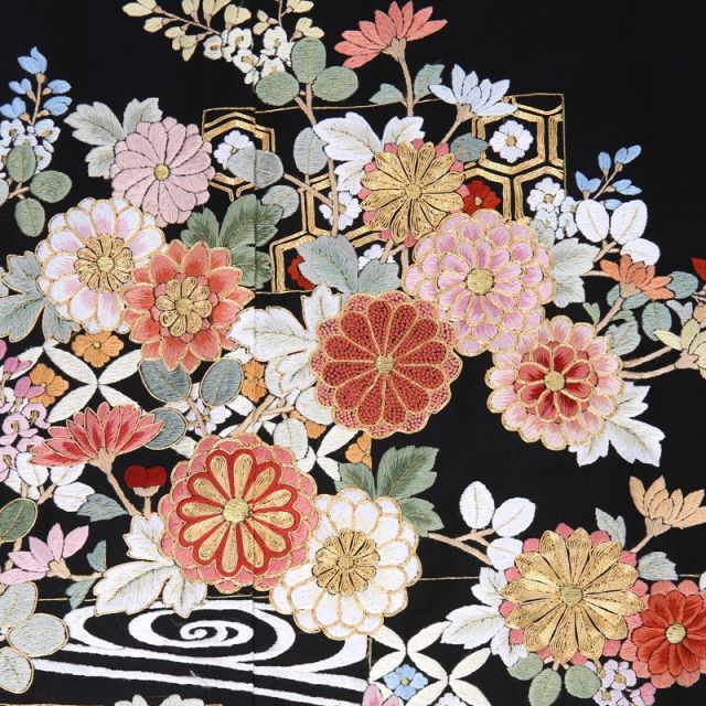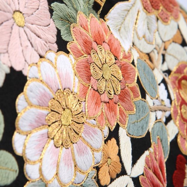 菊に藤、暖かくて優しい色合いの四季花が咲き乱れる庭園には緩やかに広がる流水がながれ、これから訪れるすべてのことをサラリと流してくれるよう。長寿や無病息災、心身の安定や子孫繁栄などたくさんの意味が込められた花々に隠れるようにして花亀甲や七宝花菱紋の円満、吉兆などの模様がそっと見守ってくれています。淡い色合いの花々には、ふんわりと立体感の出る丸い玉留めを丁寧に敷き詰めた相良刺繍や太い金糸を縫い留めた金駒刺繍がふんだんに使われていてとても華やか。