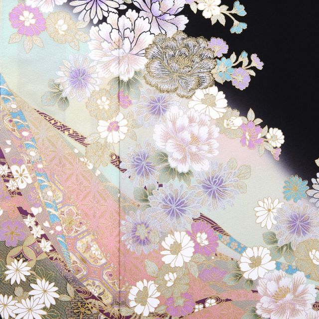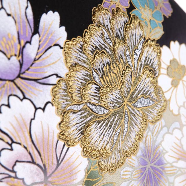 淡く優しい色合いで女性的な柔らかさを表現した黒留袖。ワンランク上の装いを選びたい方にとっておきの桂由美デザインです。涼やかな水色のかすみに薄い黄や桃色がにじむ様は、優雅そのもの。黒地を背景にして、まるで宵闇に浮かび上がるような桜。金の糸で縁取られ、神々しく輝く牡丹。その周りを囲むように、八重桜や菊が豊かに散りばめられ、まさに百花繚乱の情景です。花弁や葉脈などの細かい部分は金色を用いて、より高貴な印象に。花たちの後ろでたなびく熨斗や反物にも細やかな伝統柄がほどこされています。蜀江文や流水に紅葉など、見るたびに新しい発見があるでしょう。後ろ姿も際立たせる華やかな柄行き。伝統的なモチーフをふんだんに使った格式あるスタイルは、晴れの日の気分を一層盛り立ててくれます。