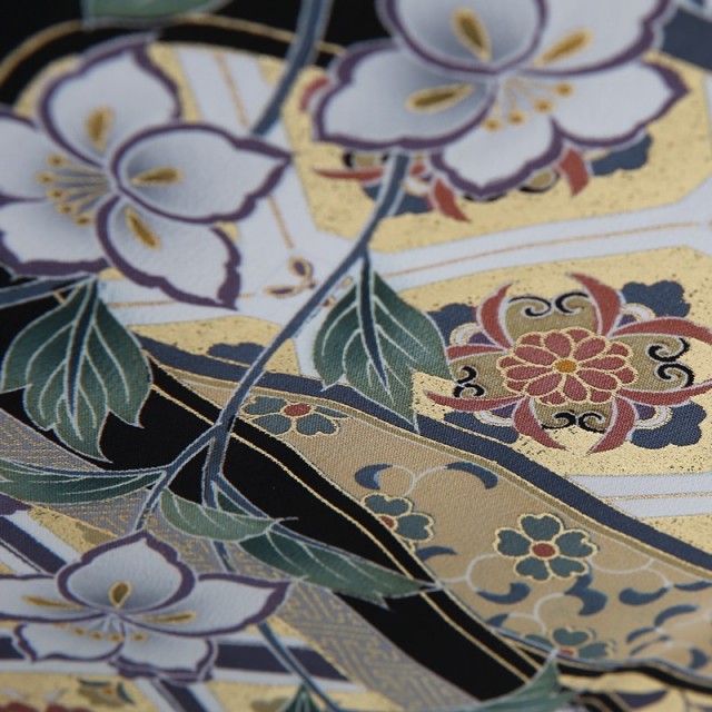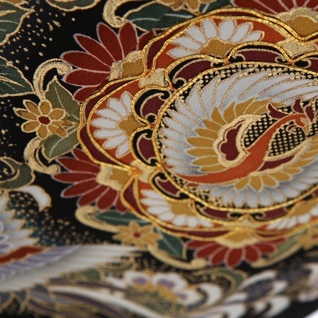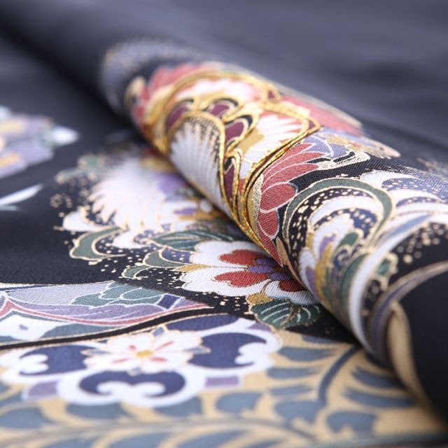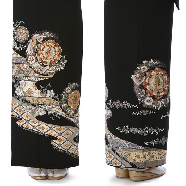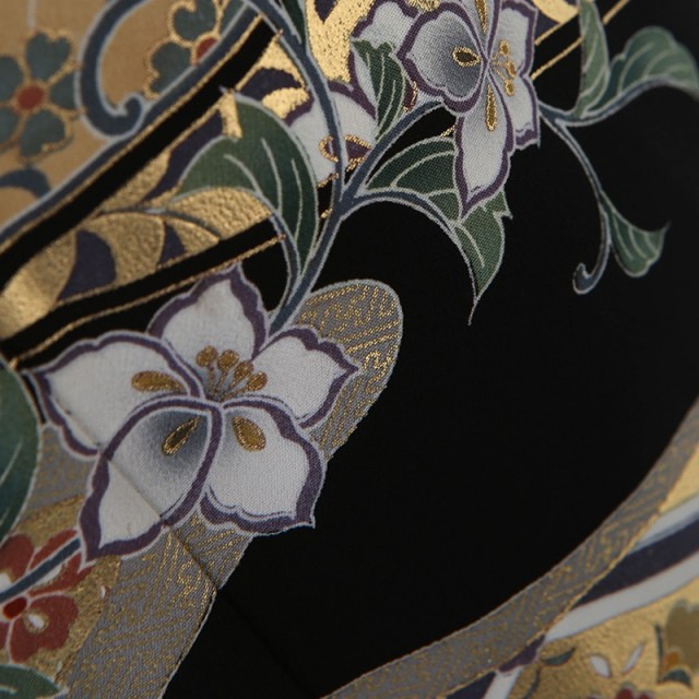 灰色がかった紫が全体の文様に使われ、派手すぎないしっとりした雰囲気を醸し出しています。特に中心的に描かれているのは「正倉院文様」と呼ばれる、長く日本で使われる格式高い文様です。正倉院とは、奈良の東大寺にある倉庫の名称。ここでは奈良時代にシルクロードを通ってやっきた海外の古い宝物が保管されています。それら海外の調度品などの布にあしらわれていた文様を着物に取り入れるようになり、やがて「正倉院文様」と呼ぶようになりました。こちらの黒留袖で使われる花をシンボル化した「 華文」や中国から入ってきた幸せを意味する空想の鳥「鳳凰」は「正倉院文様」の代表格で、格調高く、上品な着上がりにしてくれます。また着物全体を水が流れるような「流水」の文様は人生を意味しています。小さな小川を流れる1滴の水も大河に繋がっており、そんな永遠に続く水の流れに、昔の日本人は永遠の人生への願いを込めました。華やかなお祝いの場にぴったりな気品溢れる1着をお楽しみください。