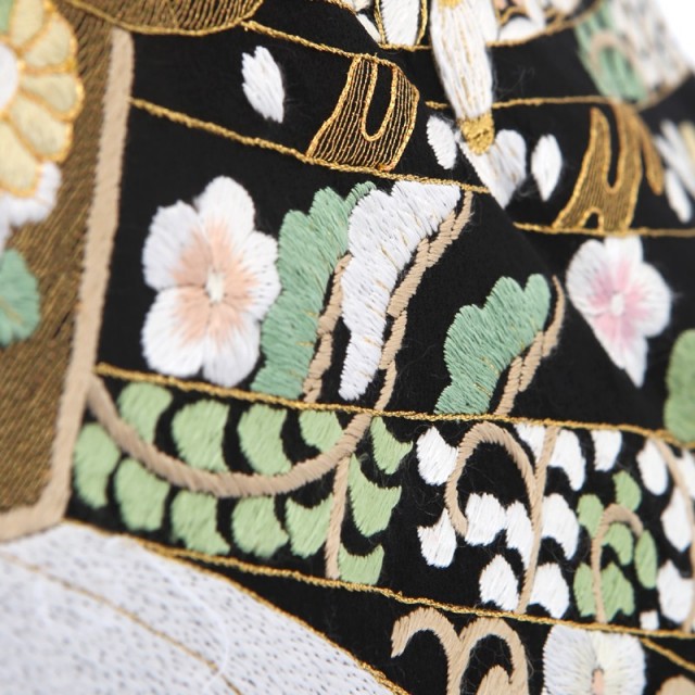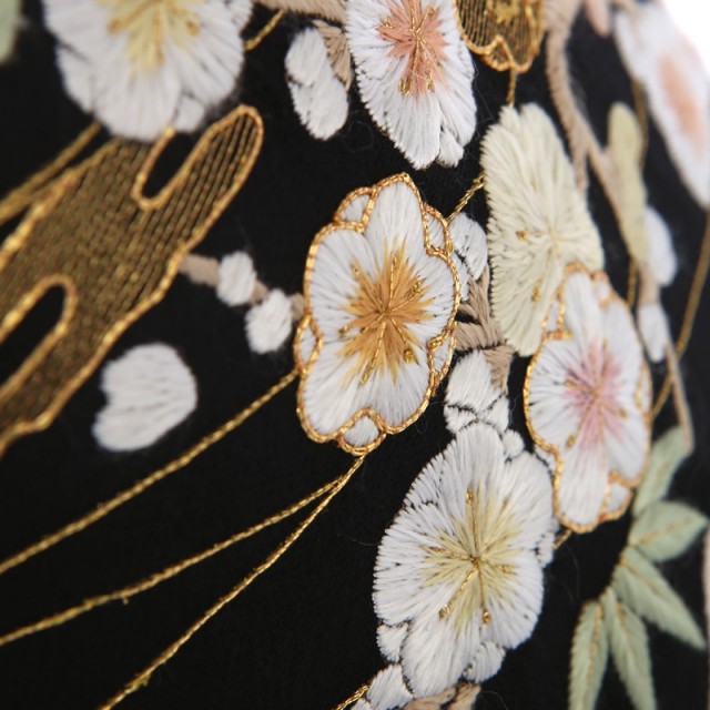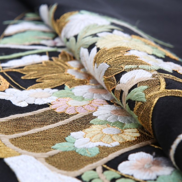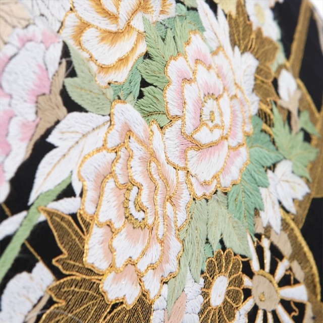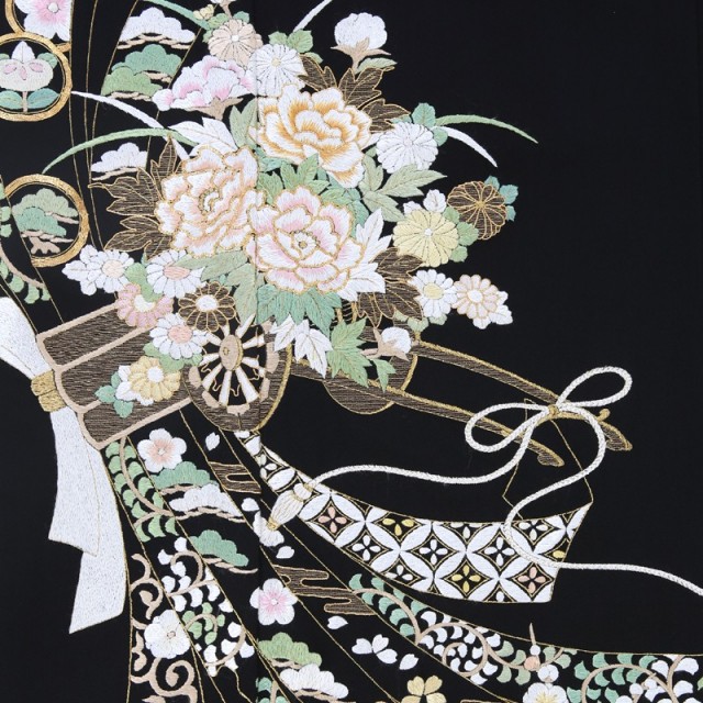 古典文様「花車」と「熨斗(のし)」をすっきりと描いたこちらの黒留袖。シンプルなデザインなのにとても目を引きます。その理由は着物全体へと施された細かく美しい総手刺繍です。こちらの文様をよく見てください。職人の手による刺繍が施されており、完成までに非常に手間がかかっています。それでも手刺繍にこだわるのは、機械では表現できないグラデーションや細い線までも美しく表現することができるから。その繊細な表現は着物へ高級感を与える共に、周りからの目も引きます。また使われている2つの文様にも意味合いがあります。まず一番に目を引く「花車」は貴族が乗っていた牛車に四季の花を乗せたもの。花々の美しさだけでなく、牛車が意味する貴族の繁栄と豊かさが、さらに華やかに仕上げてくれています。特に百花の王とも呼ばれる「牡丹」が大輪でぽってりとした姿が印象で的です。裾全体に描かれた帯状の文様は「熨斗」で、元々は神様のお供であり、長寿をもたらす縁起物とされていました。熨斗の中にも繁栄を意味する「唐草」、魔除けの「菊」、縁起物の代表格「松竹梅」が描かれています。豪華な刺繍とこれらのシンプルな文様がマッチして、スッキリとした雰囲気の中にお祝いの思いが詰まったおしゃれな1着です。