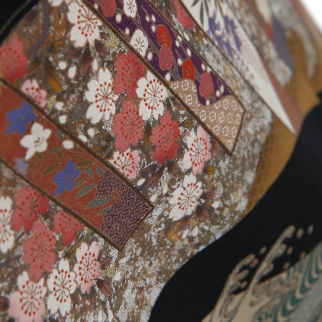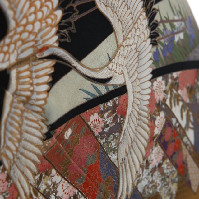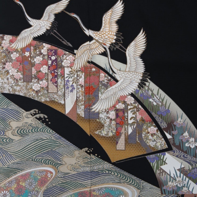 両翼を大きく広げて舞う鶴がとても印象的な黒留袖です。鶴は千年、亀は万年、と言われているように長寿や吉兆の象徴をされている鶴。よく見ると、羽の1枚1枚までこまかな刺繍がほどこされているのがわかります。ていねいで緻密な刺繍がお祝い着にふさわしい豪華さを演出しています。鶴のすぐ下側には、さくらや梅、藤、ぼたんなど四季折々の花々と箔が彩りを添えます。短冊のような枠で区切られたデザインも品があり、和の雰囲気を感じさせてくれます。海の波、色とりどりの菊、菱形の文様など、裾の方まで伝統的な模様がデザインされています。後ろ側にも正面と同じように羽ばたく鶴などの柄が描かれています。鶴の左から下にかけては、淡いピンクの色合いの小さな花の模様もあり、明るくやさしい印象を作っています。正面からはもちろんですが、後ろ姿も美しい黒留袖です。
