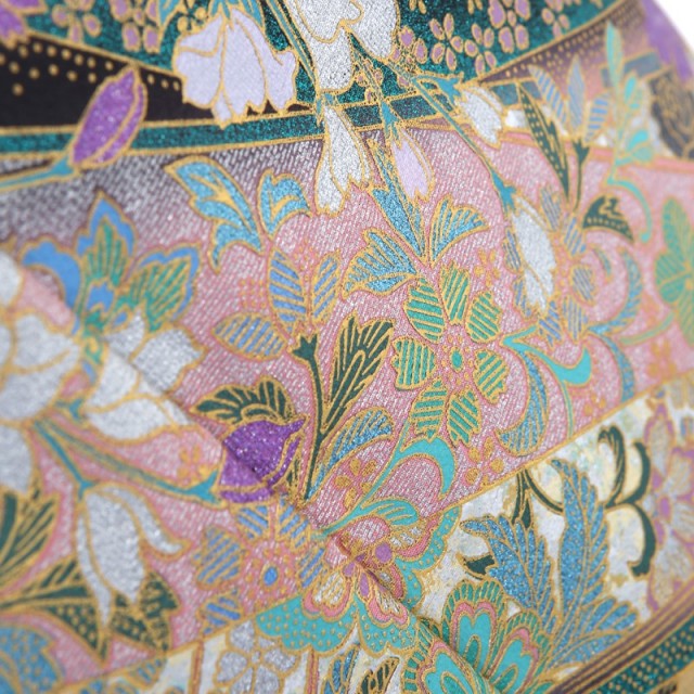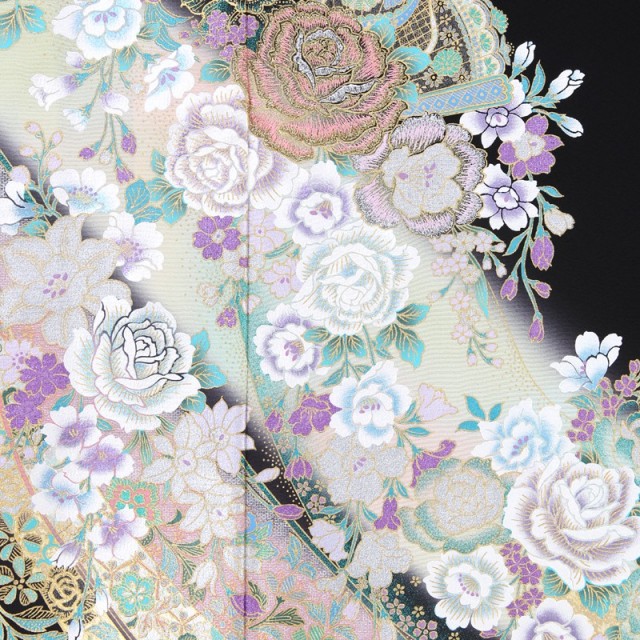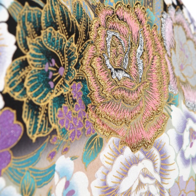 桂由美といえば、ウェディングドレスのデザイナーとして知られていますが、実は着物のデザインもされているんです。こちらの黒留袖は桂由美らしいモダニズムを取り入れつつ、しっかりと古典的な美しさも表現しています。和洋を融合した眩しいほどの美しい仕上がりです。一番に目につくキラキラと輝く「薔薇」は、ラメの入った糸による刺繍を施すことで、眩く浮かび上がるかのよう。近代になって西洋から日本に入ってきた「薔薇」は、その可愛らしさから愛情という意味を持っており、古典文様にも負けないほど、お祝いの席にはぴったりの文様です。また薔薇の上に描かれた「扇子」は扇面が透けていて、レースのようなデザインになっています。日本の古来から使われる「扇子」の文様とは一味違い、海外のもののようです。そんなところも和洋を融合させたようで、遊び心があります。また着物全体の文様配置は古典的ですが、色味はエメラルドとパープルを多用することで、モダンな雰囲気を醸し出しています。古典とモダンを見事に融合し、物語の1ページを描いたかのような美しい世界をお楽しみください。