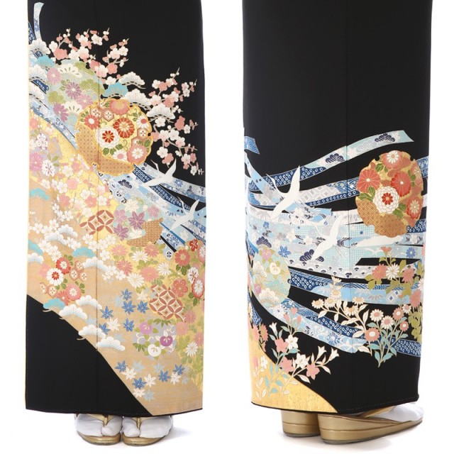 ウェディングドレスのイメージが強い桂由美が、古典的な美しさを踏襲した爽やかで美しい黒留袖をデザインしました。「祝いの風」というタイトルがついていますが、その名の通り風になびく「熨斗」、空高く舞い立つ「鶴」、華やかさを演出する縁起の良い草花が、爽やかに祝いの気持ちを表現しています。進物に添える「熨斗」は元々は神様へのお供え物であり、長寿を意味します。おめでたい席に欠かせない「鶴」は、長寿の象徴として吉祥を意味する鳥。「鶴」は一度夫婦になった相手と一生添い遂げることから、夫婦円満という意味も持っています。そのほかの文様はどれもクラシックな日本人が大切にしてきたものばかり。植物は縁起の良い意味を持つ「梅」「松」「菊」「橘」「桜」「楓」などが描かれています。様々な季節の草花でもあるので、着用季節を問うことはありません。また円が重なり続ける「七宝」は永遠の意味を持ち、大きな円形の「雪輪」は雪の結晶をデザイン化したもので、豊作を意味する吉祥文様です。このように、どの文様にもおめでたく幸せへの思いが込められています。着物でおめでたい気持ちを表現したいなら間違いのない1着です。