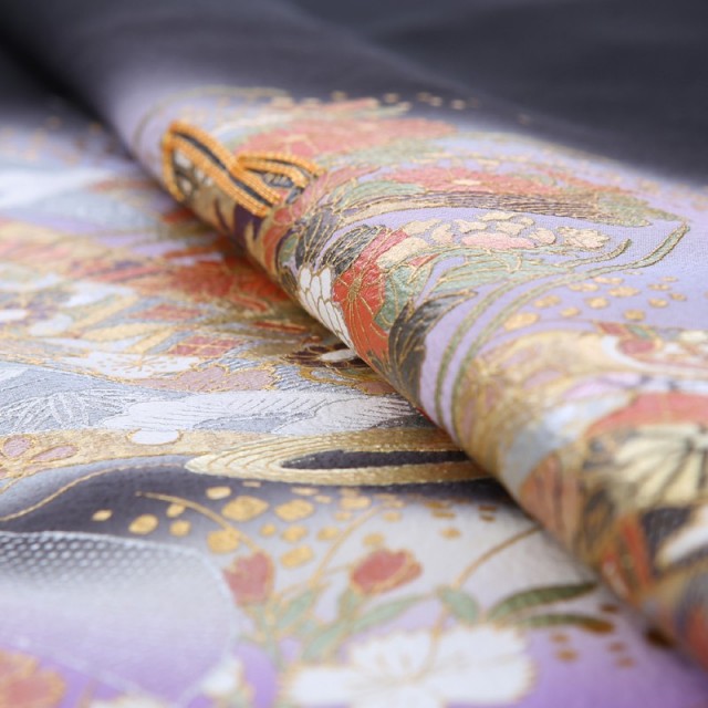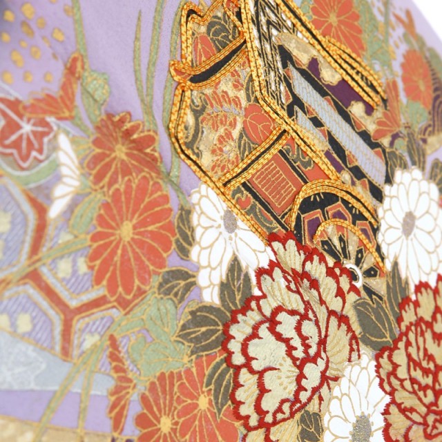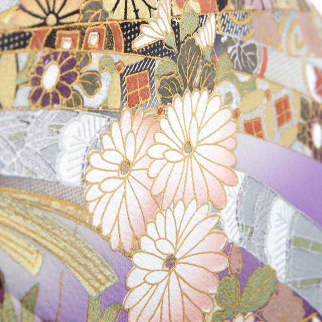 ゴージャスでキラキラした「熨斗」と「御所車」とは対照的に、優しい紫のぼかしが柔らかさや暖かさを感じさせ、貴族の世界を柔らかく描いています。桂由美らしい現代的なぼかしの色使いと正統派の伝統文様が絶妙なバランスで魅力的です。こちらに描かれる熨斗は帯状の複数の熨斗を束ねた「束熨斗」と呼ばれるものです。それぞれが伸び広がる姿は着物全体に華やかな動きをプラスしてくれます。進物に添えるのが一般的な「熨斗」は古くは神へのお供え物とされ、おめでたい意味を持っています。お祝いの席にぴったりの文様。「束熨斗」の上に描かれる「御所車」は平安貴族が乗っていた牛車のことで、その華やかさと平安文化の繁栄から、現在でも気品高い文様として使われています。その周りに描かれた「牡丹」と「菊」は牛車をさらに華やかにさせます。「菊」は災いから身を守る花と信じられ、「牡丹」は百花の王とも呼ばれ、その可愛らしい咲き姿が古くから愛されてきました。どちらも古典的な文様です。「源氏車」は金糸、「牡丹」には赤い糸で刺繍が施され、着物をさらに高級感を与えています。モダンな雰囲気もプラスされた中で古典文様をお楽しみいただける1着です。