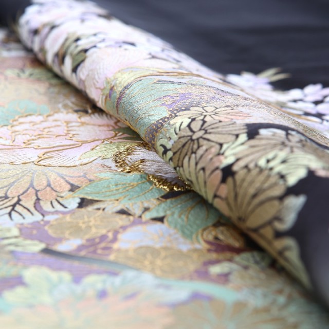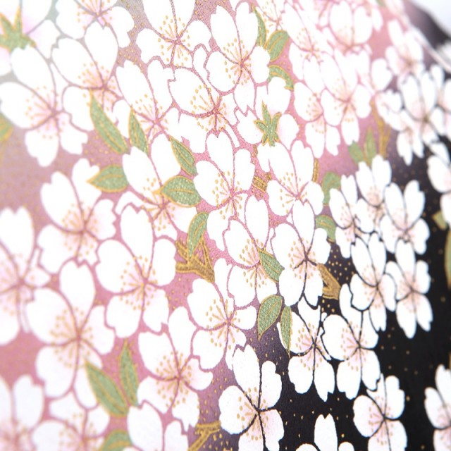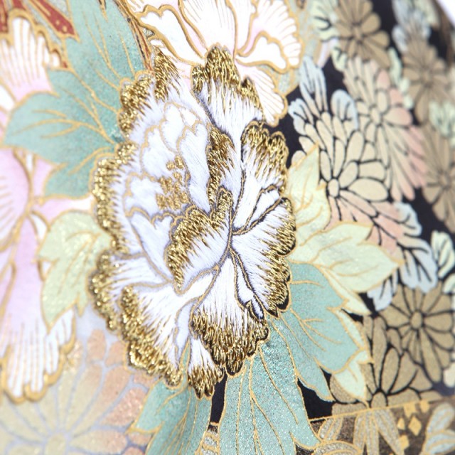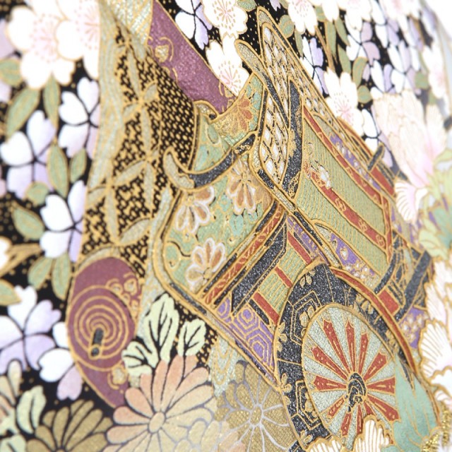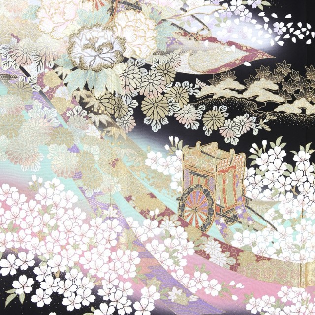 平安貴族がお花見をする光景を切り取ったような、優雅で格調高いこちらの黒留袖。まず「桜」は日本人にとって馴染みが深い花で、平安時代から春にはお花見を楽しんでいたと言われています。その美しさだけでなく、新たなスタートを応援してくれるような存在であることから、おめでたい席の着物に使われることが多い文様です。桜に包まれるように描かれた「御所車」はまさに平安貴族の象徴です。乗り物として貴族が使っていたことから、品格と繁栄を意味します。さらにお着物を豪華に仕上げているのは中心に描かれた「牡丹」です。金と白の糸を使った刺繍がキラキラとした印象を与え、牡丹をふんわりと立体的に表現しています。「牡丹」はそのダイナミックに可愛らしく咲く姿から、百花の王と呼ばれ、華やかさを表現するにはぴったりのお花。着物全体の上品な雰囲気に可愛らしさをプラスしてくれます。そのほかにも細かく草花が描かれていますが、「松」「菊」「竹」「紅葉」など四季を感じさせると共におめでたい意味を持つ縁起が良い伝統紋様ばかりです。上品さと可愛らしさを持ったこちらのお着物は、幅広い年代の方にもお楽しみいただけます。