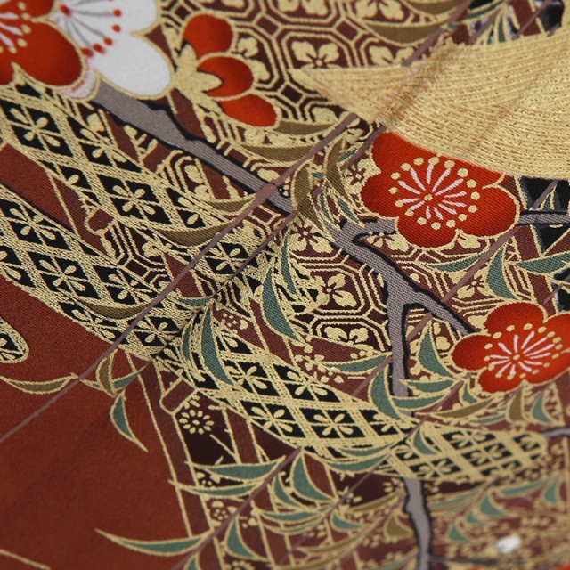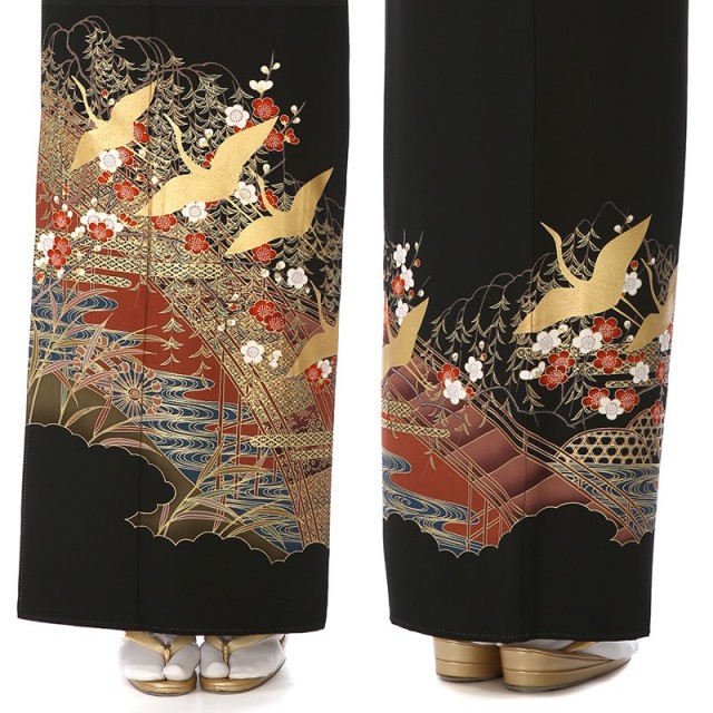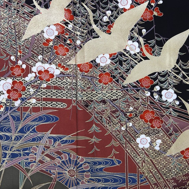 お祝いの席にふさわしい豪華な金彩でダイナミックに古典文様を描いています。金一色で描かれる飛ぶ鶴の姿を表す「飛翔」は、お祝いの席で使われ、古くから大切にされている吉祥文様。そのすっとして美しい姿から、おめでたいことが起きる前兆を意味しています。また鶴は1羽のパートナーと生涯をともにする習性があり、夫婦でずっと仲睦まじく暮らしていけますようにという願いが込められています。婚礼のお祝いの気持ちを表現するにはぴったりの文様。おめでたい意味を表す紅白で描かれる「梅」は、まだ春がくる前の寒い時期に、ほかの花々よりも早く花を咲かせます。その寒さの中でも美しく気高く咲き、もうそこまで来ている春の到来を予感させることから、力強さと明るい未来を予感させる華やかな文様です。またクールさをプラスするのが庭園を表すような橋と水の流れ。貴族の庭園を表すような高貴さを感じさせるだけでなく、止まることのない「流水」は永遠の命を意味し、幸せな人生がずっと続くようにという願いが込められています。お祝いの気持ちを表現した豪華で品のあるデザインをお楽しみいただけます。※鶴部分は刺繍の上に金箔が付いた特殊金彩となります。