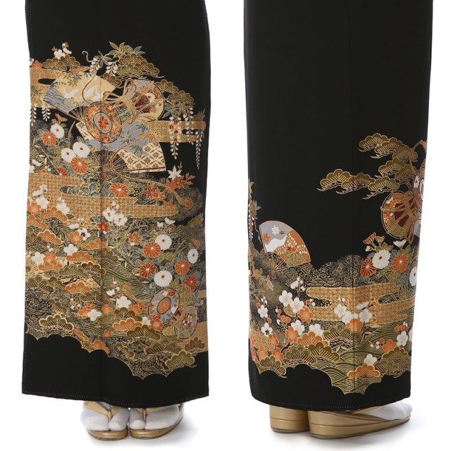 こちらは華麗な金彩と気品溢れる古典文様が全体をゴージャスに仕上げている品のある黒留袖です。大きく描かれる「扇子」と「鼓」はどちらも雅やかな様子を表しています。平安貴族が常に身につけていたと言われる「扇子」は平安の世のような繁栄、貴族のよう高貴な高貴さを意味するおめでたい文様です。和楽器として知られる「鼓」はその柄や紐の曲線が美しく、上品な雰囲気をプラスしてくれます。また能楽に使われ、「音がよく鳴る」という言葉が転じて「物事が良くなる」という意味があり、おめでたいお祝いの席にはピッタリです。雲や霞の切れ間から覗くようなデザインで描かれている豪華絢爛な草花もこちらのお着物の特徴的なポイント。5つの山型が連続して並んでいるぽてっとした文様は「松」です。ダイナミックな枝ぶりと1年中緑を絶やさないことから、繁栄を象徴するおめでたい意味を持ち、吉祥文様として古くから大切にされています。同じく吉祥文様の「梅」はほかのどの花よりも早く、春の訪れを告げるように美しい花を咲かせます。寒さに耐えながらも咲くその強さから健康や忍耐の意味もあり、婚礼の席に華やぎを加える紅白の花びらが魅力的です。細かなところにまで入れられた金彩と文様の美しさがマッチして高級感のある仕上がりとなっています。