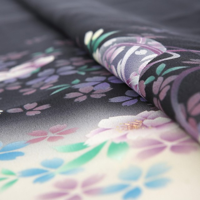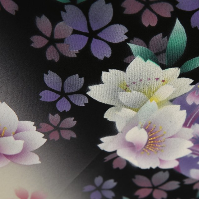 紫を基調とした優しく穏やかな雰囲気が魅力的です。「手毬」は女性を象徴する文様として古くから大切にされてきました。昔は女の子の遊び道具として「手毬」がよく使われており、女の子にとってとて身近なものでした。またその丸い形から、物事が丸く円満に収まりますようにという願いも込められています。魔除けのお守りとして嫁入り道具のひとつとしていた地域もあるほど、結婚して実家を離れても幸せであって欲しいというご家族の思いがこもった文様です。その周りには様々な色や形で「桜」が描かれています。春を体現したようにあたたかくなるとあちこちで満開を迎える「桜」は、その季節の意味合いだけでなく、新たなスタートを予感させる花です。これから明るい未来へ進んでいって欲しいという願いが表れ、着物の文様としては季節関係なく着用できます。婚礼のお祝いの気持ちをシンプルなデザインで優しく表現したおしゃれな黒留袖です。