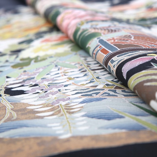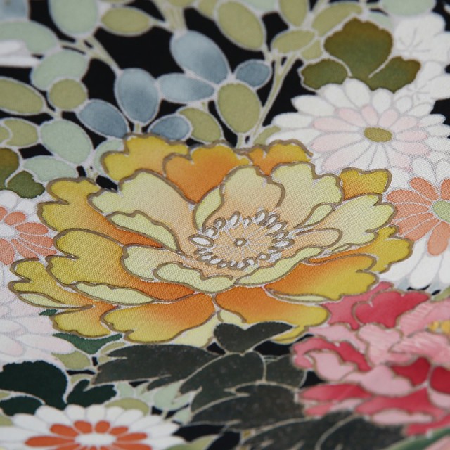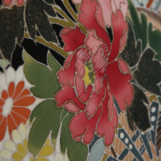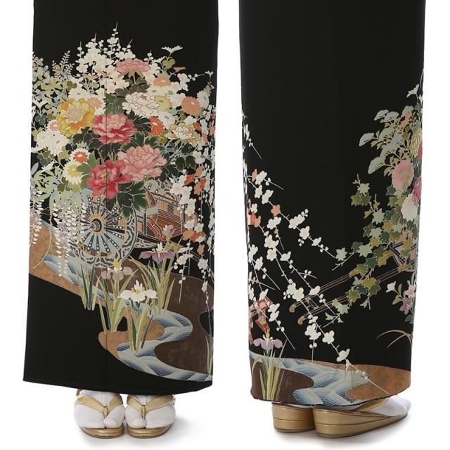 愛らしくダイナミックに描かれた花々が溢れ出しそうなほどに描かれ、華やかな仕上がりになっています。貴族を彷彿とさせる牛車に花を乗せた「花車」の文様は、貴族の高貴さや繁栄に加え、花々の華やかさを表現した古典文様です。こちらの「花車」には様々な種類の花が乗せられ、まさにお祝いの席にぴったりの華やぎがあります。中心に描かれる赤やピンクが可愛らしい「牡丹」は、その可愛らしく大輪に咲く姿から、気品あふれる女性を表します。その周りには子孫繁栄を表す「藤」や延命長寿の「菊」、繊細な枝ぶりが描かれた忍耐や繁栄を意味する「梅」など、どれも古典的でおめでたいものばかり。また裾の方には小川を流れる水の文様「流水」が描かれ、その近くには水辺に咲く「杜若」が凛とした姿で咲き誇っています。水の流れは止まることなく続くことから、「流水」には永遠に幸せな人生が続きますようにという願いが込められています。古典文様を華やかに描くことで、古さを感じさせない可愛らしく華やかな仕上がりとなった黒留袖をお楽しみください。