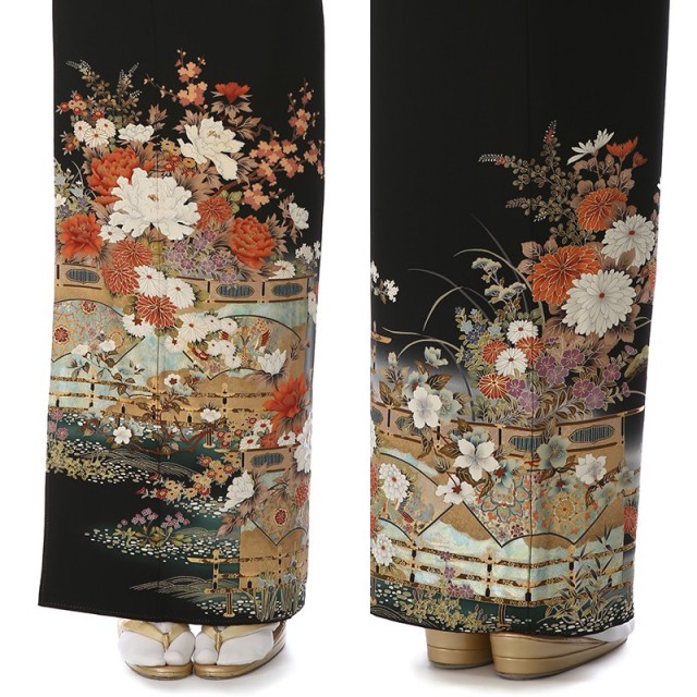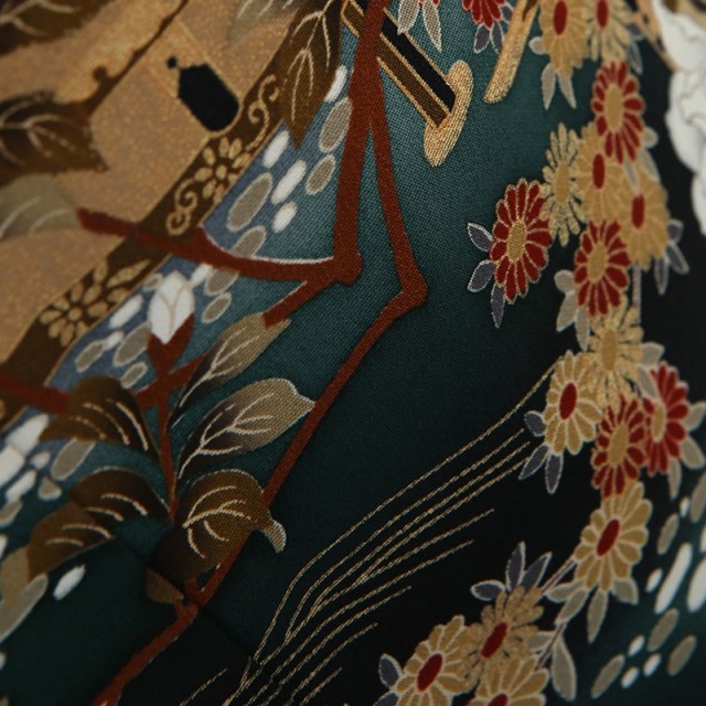 古典的なおしとやかで華やかな世界観を表現した上品な1着です。溢れ出すようにダイナミックに描かれる草花はどれも古くから大切にされてきた古典文様。幾重にも重なった大輪の「牡丹」は百花の王という別名を持つ、華やかさでは随一の植物。古来中国の伝説では理想郷に咲く花とされ、日本ではその美しさから気品あふれる女性を象徴すると言われています。その周りには浄化や延命長寿の意味を持つ「菊」や日本女性を表す大和撫子という言葉でも知られる「撫子」、おめでたい意味を持つ花を代表する「梅」、日本の秋を代表する「桔梗」や「萩」など、四季折々の花々が描かれ、まさに豪華絢爛です。また庭園の景色を表すように建物と水辺が表現されています。欄間や扇面を模した壁の装飾、そして欄干など、貴族を思わせるほどに上品でデザイン性に溢れています。まさに貴族が庭園の景色を楽しむかのような高級感と知性を感じさせます。草花のおめでたい意味合いに加え、美しい庭園の雰囲気を楽しむことができる豪華な1着です。