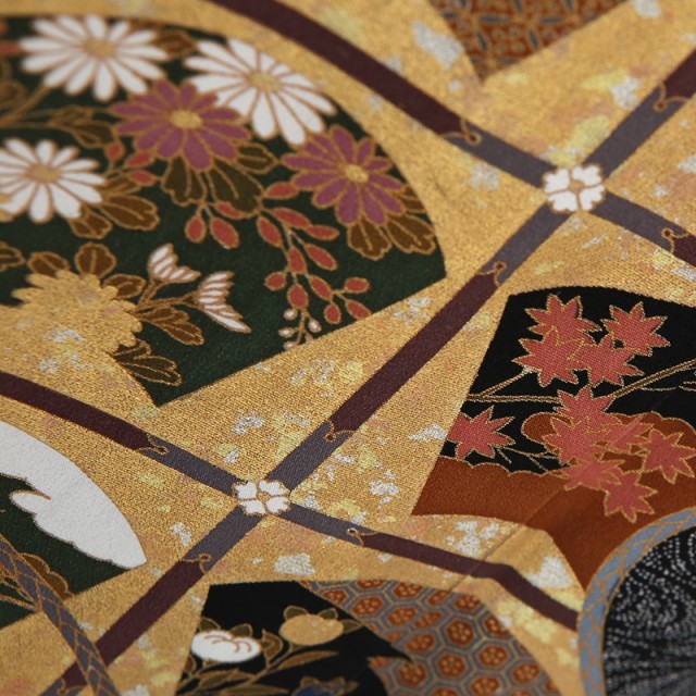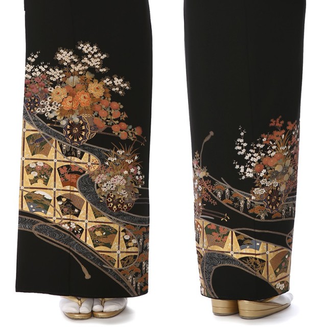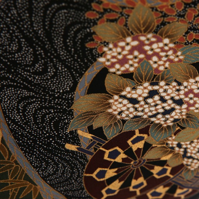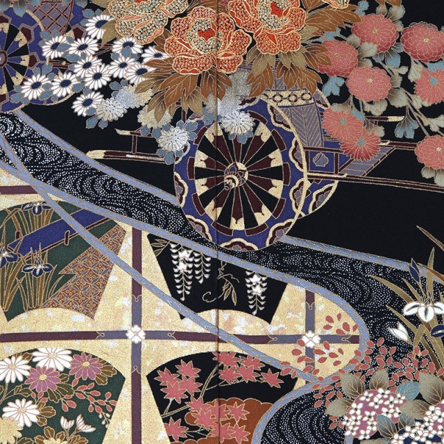 デザイン性あふれるこちらの黒留袖には、華やかな仕上がりと知性を感じさせる高級感があります。様々な絵柄があしらわれた扇子の形をした文様は「扇面」と呼ばれます。平安時代には貴族が扇子を持ち歩いていたことから、高貴で優雅な様子を表す文様です。それぞれの「扇面」は四季を表すように古くから日本人になじみの深い草花が描かれています。その中でも特におめでたい意味を持つのは「松」や「橘」です。「松竹梅」のひとつとしても知られるように、「松」は演技の良い植物の代表格。通年緑を絶やさないことから繁栄を意味しています。ハート形の実が可愛らしい「橘」は古くから日本に自生するみかんの木です。その豊かに実るみかんのように子孫繁栄という意味があります。また穏やかな水の流れとともに描かれているのは牛車に花を乗せた「花車」。平安貴族の移動手段であった牛車は貴族の繁栄や気品、花々は華やかさを表しています。百花の王とも呼ばれるほど大輪で愛らしい花を咲かせる「牡丹」には繊細で個性的な刺繍が施され、古典的な文様に華を添えています。どれも伝統的な文様ばかりで、古風な美しさを個性的なデザインで表現した現代女性にもぴったりな1着です。