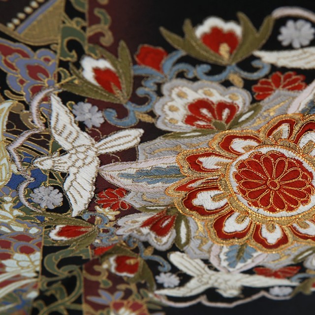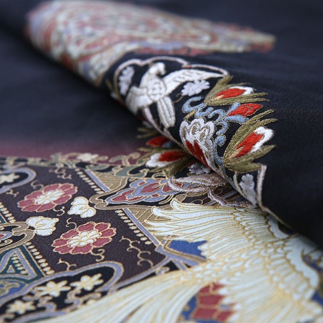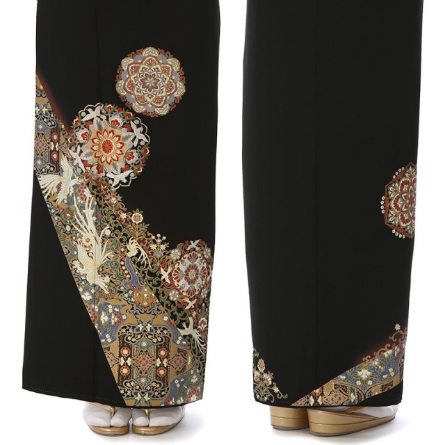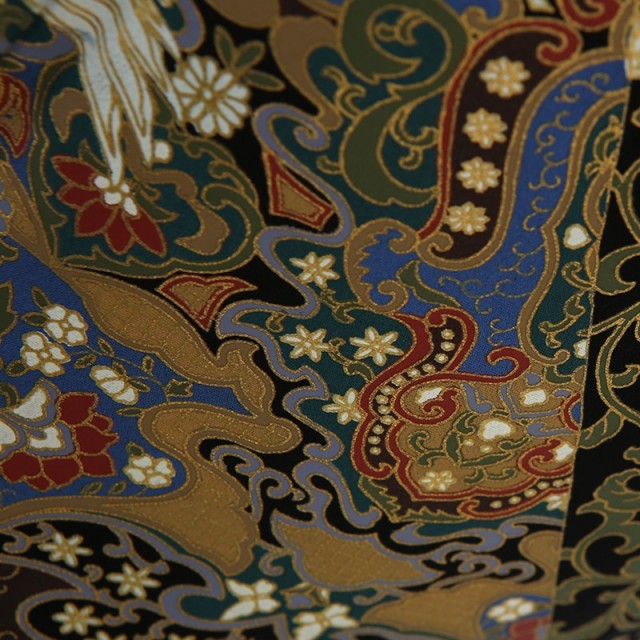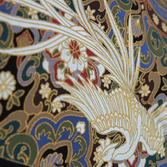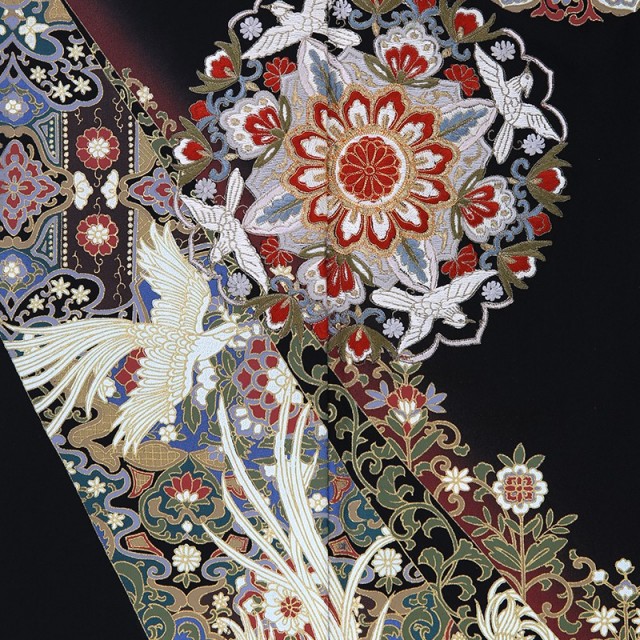 中国やインドなどシルクロードを伝って日本にやってきた宝物が天平時代にはたくさんありました。それらの織物や調度品に描かれた文様が美しく気品高い存在であったことから、日本でも格調高い着物の文様として使われています。長い尻尾と美しいシルエットで描かれている「鳳凰」は空想上の生き物ですが、吉兆を表す縁起の良い鳥として、おめでたい席にふさわしい文様です。また様々な花の美しい部分を組み合わせたような「宝相華」という文様は、元々はペルシャなどの西アジアで生まれたと言われています。華麗な花文様を意味し、実際に存在する花ではありませんが、その華やかさで上品さと可愛らしさを着物にプラスしてくれます。また唐草文様を思わせる蔓が伸び広がる様に描かれた文様もあります。「唐草」は地を這ってすぐに伸び広がる生命力から子孫繁栄の意味を持ち、花文様と組み合わせて描くことでより華やかに仕上がっています。クールにデザインされた古典の世界をお楽しみください。