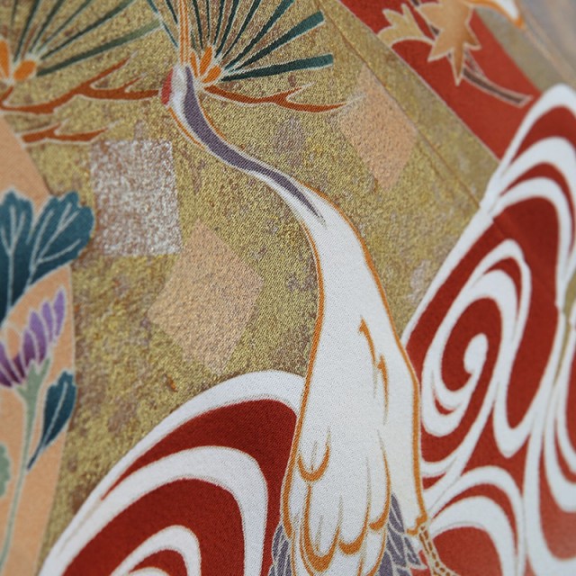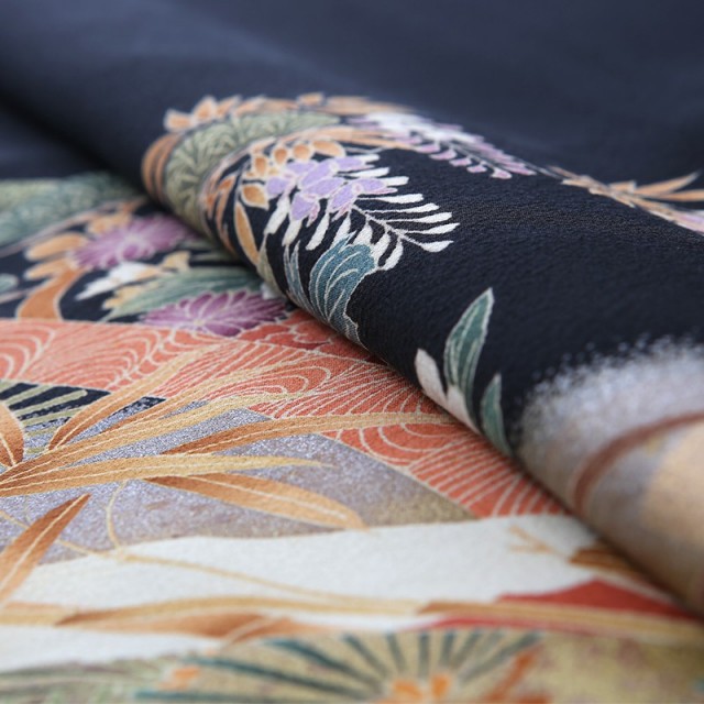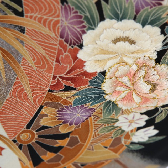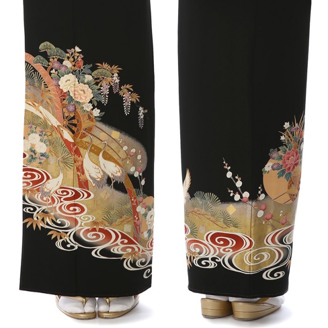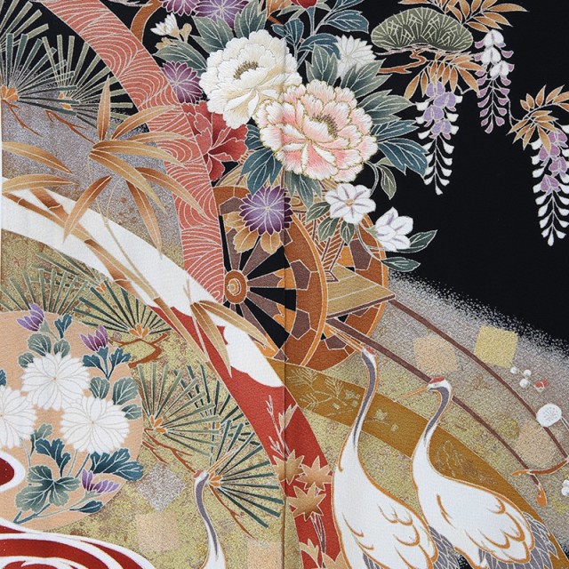 古典文様を繊細で気品溢れるタッチで描く正統派古典文様が魅力の1着です。細く長い首とその立ち姿の美しさから、昔の人々は「鶴」に品格を感じてきました。また「鶴は千年、亀は万年」という言葉がある様に長寿を象徴する文様とされています。またパートナーとなった1羽の相手と生涯を過ごす習性があることから、夫婦円満の意味もある吉祥文様です。牛車の上に乗せられた花々を表現した「花車」文様には、様々な古典の草花文様が描かれています。中心に大きく咲き、立体感を与える繊細な刺繍が施されている「牡丹」は、古来中国の伝説では理想郷に咲く富貴な存在とされています。日本では美しい女性の姿に重ね、「立てば芍薬、座れば牡丹」という言葉があるほど、愛されている花です。細い松葉が1本1本描かれている「松」は、1年中姿を変えず、青々と葉が繁ることから繁栄を象徴する吉祥文様です。紫の花が垂れ下がる「藤」は蔓植物の1種で、蔓がすぐに伸び広がる様子から子孫繁栄を意味しています。また渦を巻く様に描かれる流水文様は「観世水」と呼ばれる歴史の長い文様で、穏やかな水の流れの様に永遠に人生が続きます様にという願いが込められています。日本の古典美を表現した品格溢れる黒留袖です。