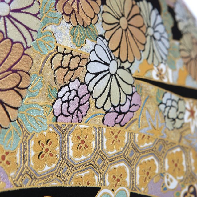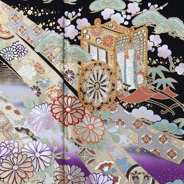 古典的な文様が沢山描かれた上品で優美なこちらの黒留袖。「御所車」は、平安貴族が用いた牛車を文様化したもの。古典的で雅な趣があります。「貝桶」は平安時代などで宮中の遊びで貝合わせというものがあり、その貝を入れておく容器が文様化されたものです。貝は他の貝とは合わない二枚貝の特徴を持つことから男女の永遠の契りを象徴するものとされており、婚礼のシーンにぴったり。他にも花々が華やかに描かれます。「菊」は、太陽の形に似ていて、最も位の高い花とされてきました。「松竹梅」は、松は年中緑を保ち、竹は雪に負けずに真っすぐ伸び、梅は冬が終わるといち早く香り高い花を咲かすことから、逆境に負けない力強さ、生命力を表しています。幸せを祈り祝う心から生まれた文様は、生活の中から生まれたもの、植物などさまざまです。それぞれに込められた意味を知るとさらにお祝いの気持ちが大きくなるのではないでしょうか。