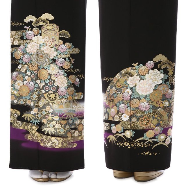 日本人の感性と美意識が生んださまざまな文様が豪華に描かれた黒留袖。美しい文様が絵羽模様として描かれます。まずは「貝桶」。平安時代などで宮中の遊びで貝合わせというものがあって、その貝を入れておく容器が文様化されたもの。貝とは他の貝とは合わない二枚貝の特徴を持つことから男女の永遠の契りを象徴するものとされており婚礼のシーンにぴったり。「松」は、厳しい冬でも緑を保ち続け、「竹」は雪に負けずにまっすぐ伸びることから、逆境に負けない力強さを表しています。「百花の王」とされる「牡丹」は富貴、高貴、幸福を表しています。やはり日本生まれのおめでたい吉祥文様は、上品で正統派な装いをしていただけます。お祝いの気持ちを着物に託せる、そんな一着になっています。