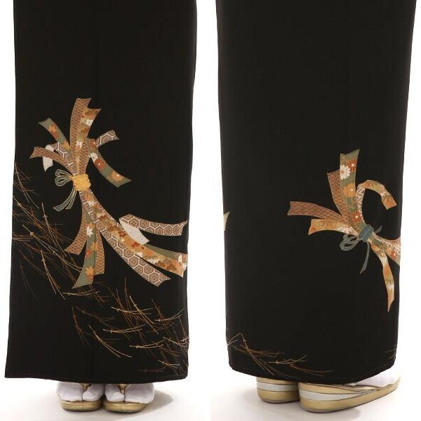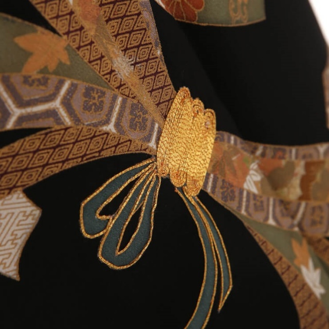 束ね熨斗と松葉の取り合わせが、非常にシンプルな黒留袖です。松葉は針金のように細い二本の葉が根元でしっかり結ばれています。このような松を二葉松(にようまつ)と言います。松の文様は本来みずみずしい生命力を象徴しますが、この二葉松は離れ離れになることがないという形から「夫婦円満」の意味を持ちます。束ね熨斗は古来より贈答品に添えられた熨斗鮑を文様化したものです。それ自体が吉祥文様なのですが、この黒留袖に配された熨斗にはさまざまな吉祥文様が詰め込まれています。まずは白地の熨斗に六角形の亀甲花菱文様が描かれています。亀甲花菱文様は亀甲つなぎに花菱を入れたおめでたい文様ですが、この亀甲花菱熨斗の裏地には紗綾型文様(さやがたもんよう)が詰め込まれ、見せないようで見せる仕掛けの凝った作りになっています。モスグリーンの熨斗には高貴な菊と紅葉が詰められ、風情豊かな情緒を醸します。松竹梅のおめでた文様が詰め込まれた熨斗もあります。熨斗の裏には、いずれも菱型の幾何学文様が詰め込まれ、上品な雰囲気を醸しています。後ろ身ごろはさらにシンプルで、束ね熨斗と数本の松葉の取り合わせに洗練さが際立ちます。