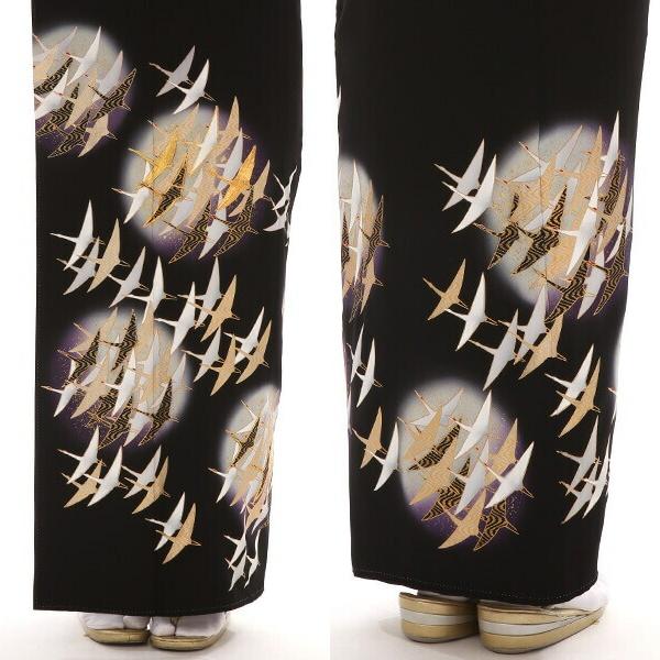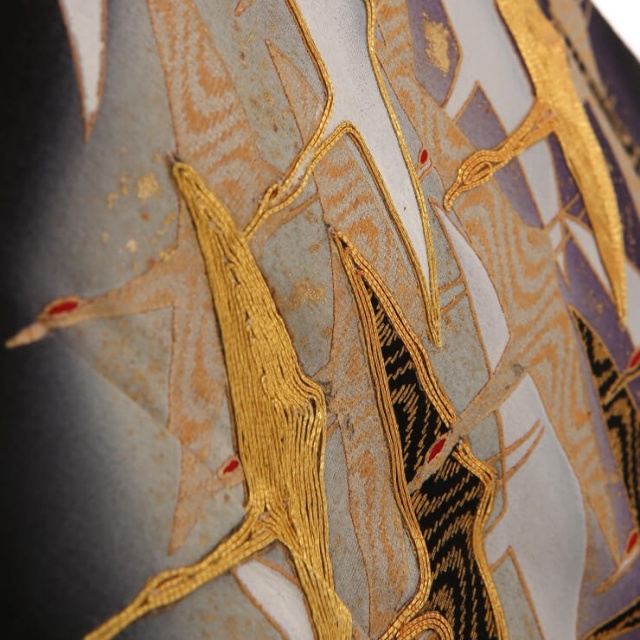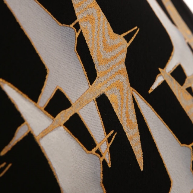 京友禅競技大会は毎年3月に開催されます。匠の意匠のみならず、機械による捺染や最先端の技術を競い合います。京都の春に行われる祭典は競技後たった1日だけ一般公開されます。そんな京友禅競技大会にて受賞したこの黒留袖は大変貴重なお着物だと言えます。多くの鶴が飛び立つ姿がとても美しいですね。描かれている鶴の頭の「赤色」から丹頂鶴と言えますね。「丹」は中国で「赤」と言う意味です。「頂」はもちろん頭と言う意味です。古来より鶴は清楚な体色と気品に満ちた体つきにより神聖化され、瑞鳥と言われ縁起の良い絵柄として好まれて描かれてきました。また「皇太子の乗る車」として「鶴駕(かくが)」と言われ「高貴の象徴」とも言われていました。道教の中では仙人と結びつけられ「長寿」であると考えられ「生命力の豊かさ」や「神秘的で縁起の良い鳥」として幸せを祝う場の着物に選ばれてきました。また一度つがいになると生涯相手と添い遂げるため「夫婦円満」の意味もあります。