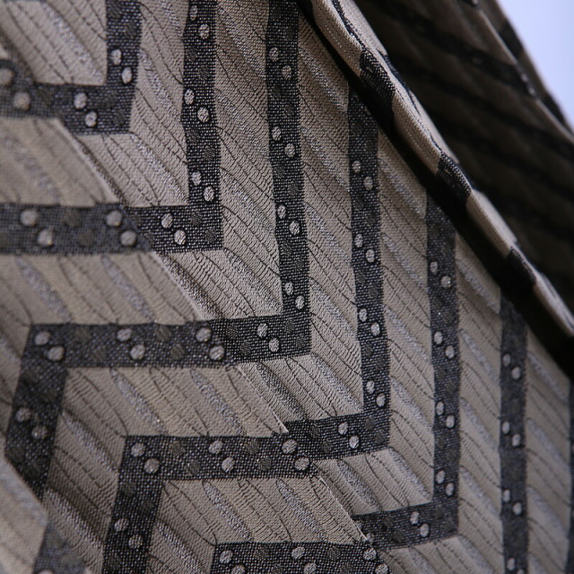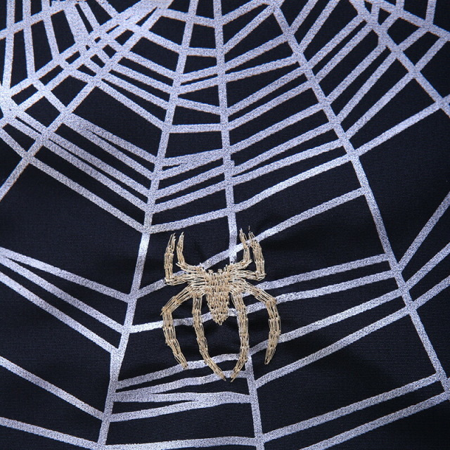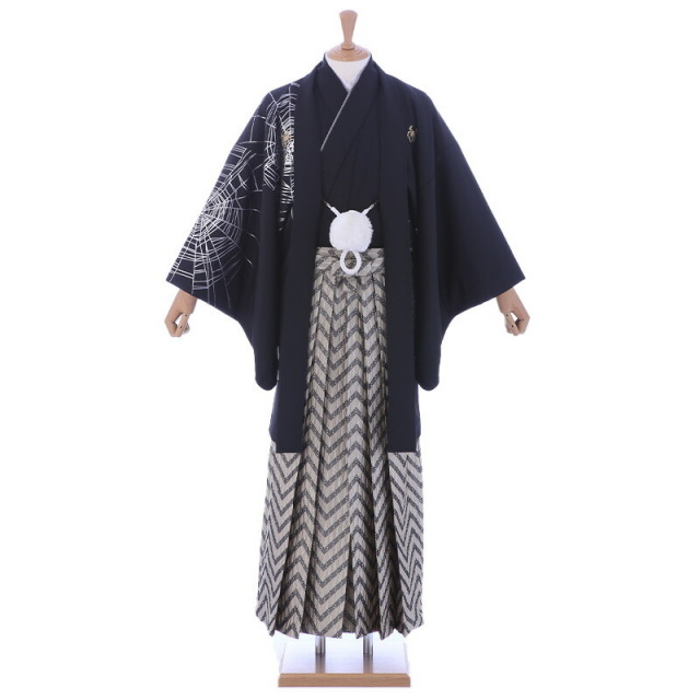 黒を基調にした個性的なデザインが特徴です。着物と羽織には地紋はなく、羽織の右肩部分には蜘蛛の巣柄が施されています。また、袴はグレーで、ジグザグの文様が華やかさを演出します。蜘蛛の巣柄は古くから縁起の良い柄とされ、親しい人の来訪を告げるとされてきました。その意味を込めて、特別な日やイベントにふさわしい一着となっています。洗練された個性と伝統的な日本文化の融合が、この紋付袴セットの魅力。
