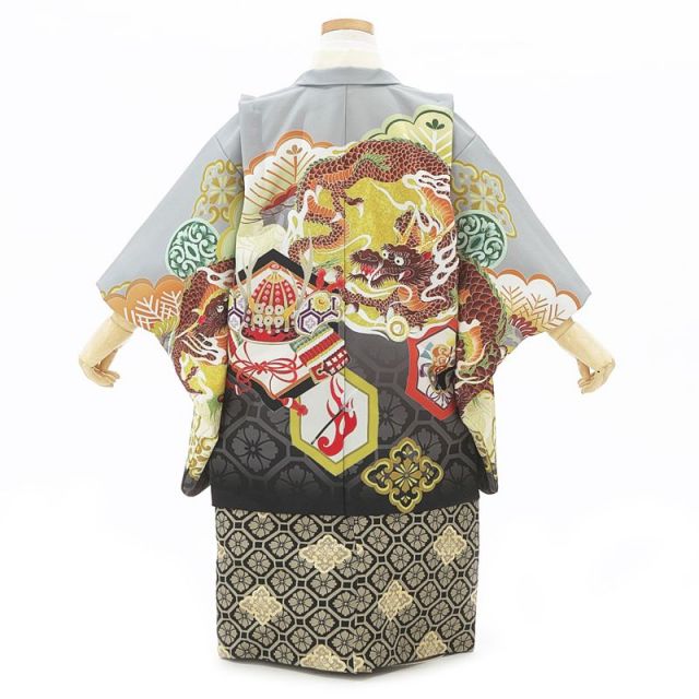 触れ合うという意味のある錫色(すずいろ)からめぐりめぐる黒檀(こくたん)色のグラデーションが高貴な雰囲気を出している3歳男児アンサンブル。四神と言われる“龍”を羽織に従えています。龍は“青龍”といわれ国の東方位を守る霊神とされてきました。東西南北それぞれ守り神がいます。西「白虎(びゃっこ)」南「朱雀(すざく)」北「玄武(げんぶ)」です。龍は、雷雲や嵐を操り、天を駆け巡ることができることから、絶大な力と強さを表しています。また、「立身出世(りっしんしゅっせ)」のシンボルでもあり、「徳」の象徴として優れたセンスを持ち合わす才能あふれる人を龍に例えることもあります。そんな龍とともに描かれている“兜”や“軍配”にも子供の成長を心から願う親心があります。兜は、「子供を病気や事故から守って欲しい」との願い。軍配は「物事にはっきり勝敗をつけ、決断力を身につけて欲しい」との願いです。袴に描かれている、花菱(はなびし)にも歴史があります。もともと菱(ひし)という植物の実を茹でて食べる習慣がありその実の形から“菱形(ひしがた)”の文言が出来ました。日本の古事記や万葉集にもよく菱(ひし)が謳われているくらい身近なものだったようです。豊かさの象徴であったようです。