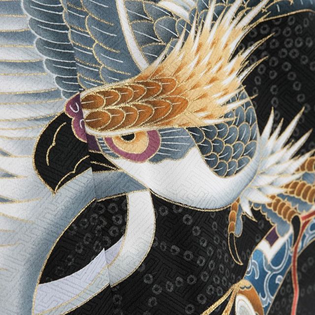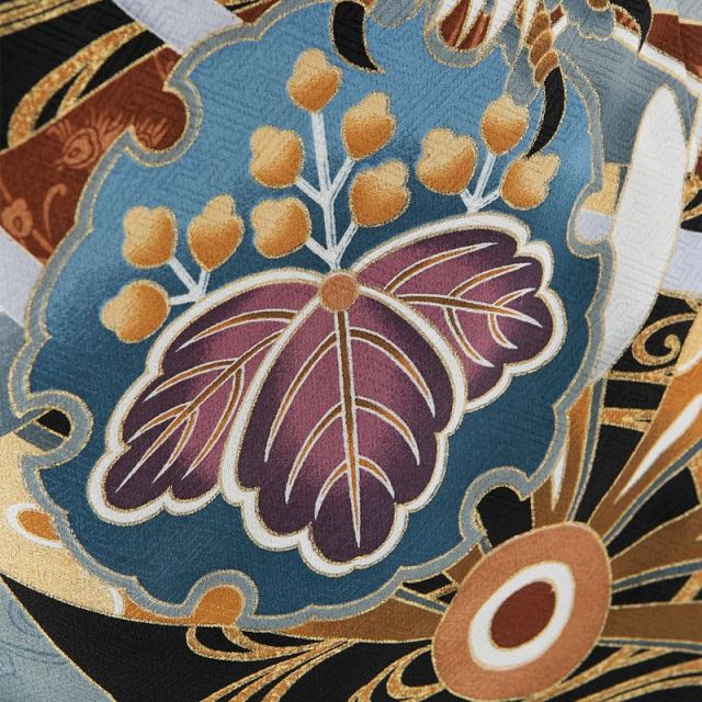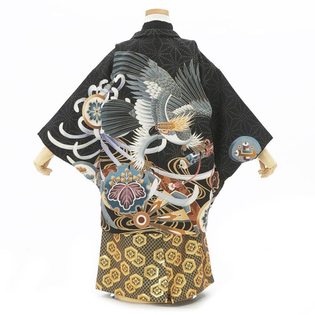 素晴らしい黒檀色のお着物に、大胆に描かれた白色の菊の花は、皇家を象徴する文様であります。長寿の象徴であるほか無病息災、邪気払い、心身を安定するなど様々な意味を持っています。袖もとにひそかに描かれている“巻物”は学問や知恵の象徴で、「知恵をつけ生涯困ることのないように」との親の願いがこもっています。羽織のお背中に描かれている“鷹(たか)”は、千里眼があり、小さな獲物も見逃さず、鋭い爪でつかんで離さないことから「幸運をしっかりつかみ、幸せを離さないように、また世間を見渡す神通力が備わるように」との親の願いが込められていますね。爪にはしっかり学問の象徴である“巻物”を掴んでいますね。お背中に描かれている“桐”の絵柄は、鳳凰(ほうおう)の棲む木として尊ばれ、菊の文様とともに皇家の文様としても用いられてきました。現代でも家紋のほか、代表的な吉祥文様としてお祝い着の着物や帯に使われています。袴に描かれている正六角形を上下に繋いだ幾何学模様は、亀の甲羅に似ていることから、「亀甲(きっこう)」と言われていて、「長寿」の象徴で非常に縁起の良い柄として長年愛されています。