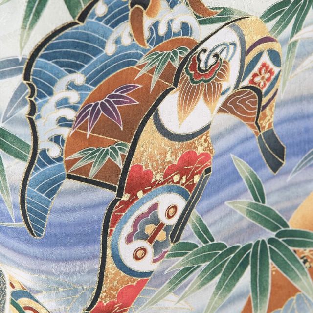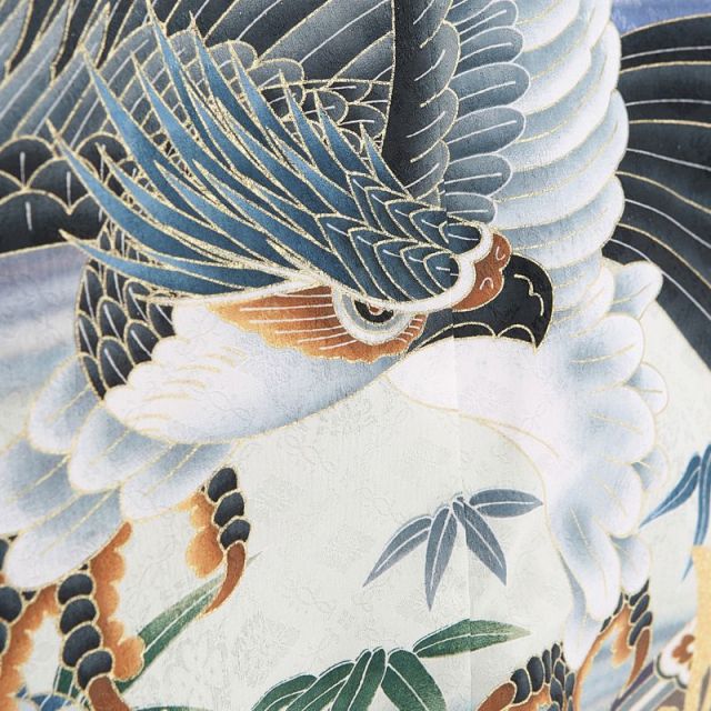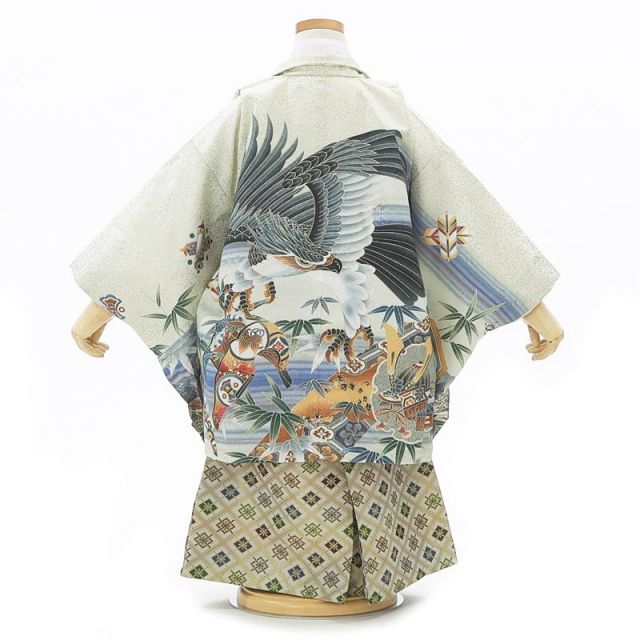 常に清らかで生命の源である青い水の流れる絵柄は“流水(りゅうすい)”と言われ、苦難や火難をさらりと流しお浄めされると言われています。その爽やかな羽織には数々のおめでたい絵柄が3歳の七五三をお祝いしています。千眼力で世の中を見渡し、捕まえた幸運や幸福は決して離さない“鷹(たか)”の絵柄。鷹での狩猟は貴族の象徴であったことから、「強く、先の世も見通し豊かに育って欲しい」との願いがこもっています。雪輪(ゆきわ)文様に兜(かぶと)の絵柄。雪輪は五穀豊穣の意味があり、兜は身を守るとされています。「子供が病気や事故に巻き込まれず、生活豊かに暮らして欲しい」との親心ですね鷹の足元に描かれているのは、馬の背中に乗せる“鞍(くら)”です。絢爛豪華に飾られた鞍は富貴や権力の象徴でした。鞍を装飾することで立派な武士としての位の高さを示したのでしょうね。袖もとに描かれている亀の甲羅に似ている絵柄は“亀甲(きっこう)”と言い、長寿の象徴でお祝い事には欠かせない文様です。爽やかな印象を持つこの3歳男児アンサンブルを着て、晴れの日をお祝いいたしましょう。