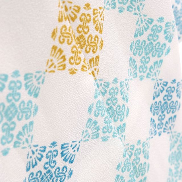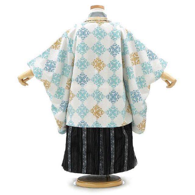 お着物はブルーグレーでシックに。羽織は、白地にブルー系とゴールド系で明るく。袴は黒地で力強く。モダンにまとめられたコーディネートです。一番外側にきて、お顔に近い位置にある羽織が明るいお色目なので、全体の明度もグッと上がります。爽やかなかっこよさが印象的です。羽織には、「変わり市松」とでも言いましょうか、幾何学文様で構成された四角形が続いています。こういった同じ形が続いていく文様のことを、お着物の世界では「繰り返し文様」と呼んだりしています。イメージしやすいところですと、市松模様や縞(しま)模様などがそれに当たります。同じものが形を変えることなく、ずっと続いていく様子から、「永遠」を意味しています。長寿・健康を願ったり、幸せが永遠に続くようにと、様々な場面で用いられる伝統的な模様です。袴に使われている縞模様も同じです。所々に組み込まれている菱形の模様も、実は繰り返し文様なんです。このコーディネートをご覧いただくだけで、繰り返し文様がどれだけお着物の世界で重用されてきたかがお分かりいただけるかと思います。大切なお坊ちゃんに、これから先長い人生を幸せにお過ごしいただくために…、思いのこもった素敵な晴れ着をオススメいたします。