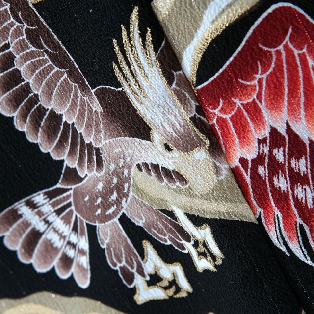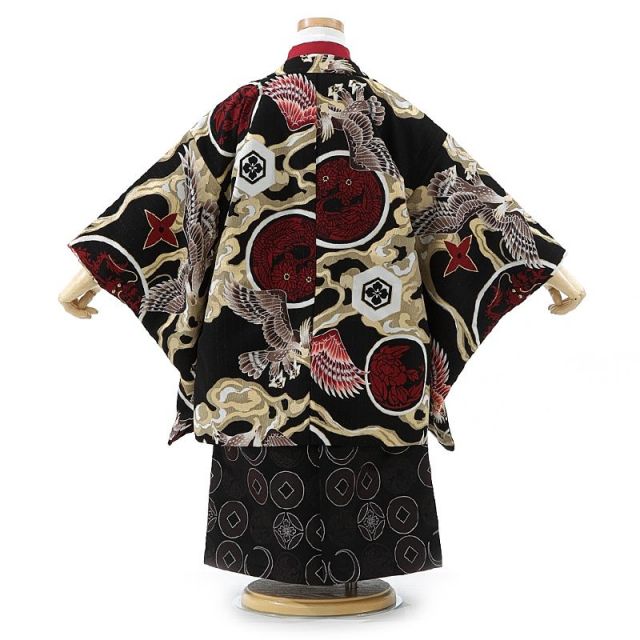 一目見て、「男の子が好きそうなデザインだな!」と感じました。赤と黒を基調とした、こちらのお衣装は、老舗着物問屋「京都丸紅さん」が展開している「JAPAN STYLE」というシリーズの一つです。“子供たちの未来を拓くジャパンスピリッツ”をテーマに、多くのスポーツ選手のひたむきに努力する前向きな姿勢や、誠実な人柄をイメージしてデザインに表現されたとのこと。世界で活躍する日本選手のデザインとあって、体を動かすことがお好きなお坊ちゃんにも、喜んでいただけるのではないでしょうか。今作のモチーフは「昇り龍」です。龍は言わずと知れた伝説上の最強の生き物です。天高く昇っていく勇ましい姿に、男らしさを感じさせます。その様は、悟りを求めて修行に励む姿を表し、向上や上昇・叶えるという意味を持ちます。とても縁起の良い、背中を押してくれるような文様です。ご自分の目標に向かって、ひたむきに努力を重ねていかれるように、成功への階段を昇っていかれるように、勇気を与えてくれる晴れ着です。