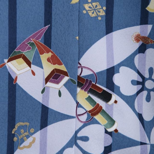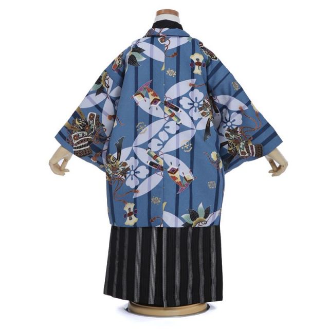兜と宝尽くしの文様が散りばめられた、縁起が良い装いです。抑えめの青に紺の縞が入った地に描かれているのは、兜と宝尽くし。いずれも昔ながらの吉祥文様です。端午の節句でおなじみの兜は、その人を守ってくれるという意味を持つと共に、権威の象徴でもあります。宝尽くしとしては、隠れ蓑、丁子(クローブ)、七宝、宝巻と巻軸。宝尽くしの一つ一つには、身を守ってくれたり、希少価値のあるものだったりと、縁起の良い意味が込められています。あくまで伝統的な文様ではありますが、どこか軽快なタッチで、楽しい印象に仕上がっています。着物は黒い無地のもので羽織を引き立てました。袴は、裾に向かって濃くなる裾濃(すそご)のグラデーションが格調高さを演出しつつ、白い縦縞が重さを感じさせずすっきり見せてくれます。みんなでお祝いしてあげたい初めての七五三、伝統的な縁起物が描かれた、自信を持ってお薦めできる装いです。