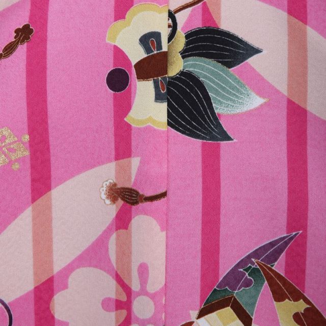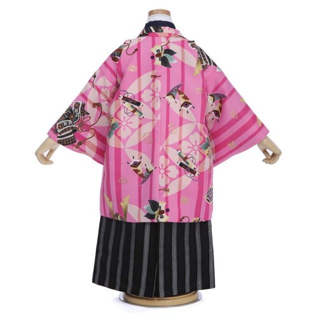 男の子の着物には珍しい、ピンクの羽織が目を引く装いです。地は、明るいピンクに同系の縦縞、そこに兜と宝尽くしが描かれています。いずれも昔ながらの吉祥文様です。端午の節句でも飾られる兜は、身を守ってくれるという意味を持つと共に、権威の象徴でもあります。宝尽くしの隠れ蓑、丁子(クローブ)といった一つ一つの文様には、身を守ってくれたり、希少価値のあるものだったりといった、縁起の良い意味が込められています。ピンクの地色の印象が強い羽織ですが、描かれた文様はあくまで伝統的。色で遊びを感じさせつつ、文様で守る、現代らしいバランスではないでしょうか。着物は紺地のもので羽織を引き立てました。袴は、裾に向かって濃くなる裾濃(すそご)のグラデーションが正装感を演出しつつ、白い縦縞が軽やかな印象を与えてすっきり見せてくれます。まだあどけない3歳の笑顔にはこんなピンクも似合うはず。羽織の色合いに目を留めていただけたなら、是非お薦めしたい装いです。