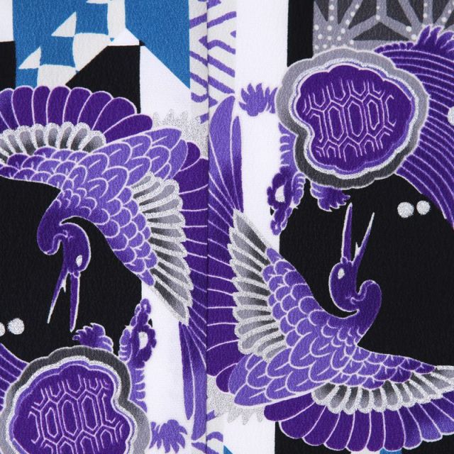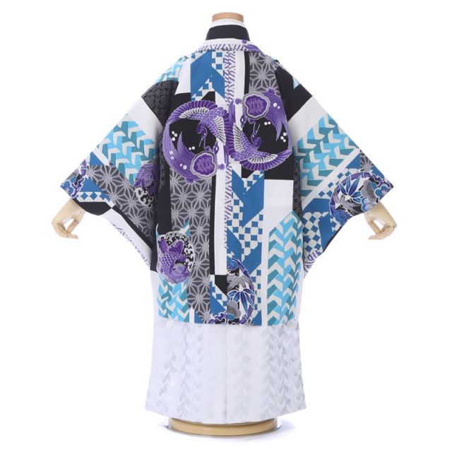 青系統で色味はすっきりと、だけど文様は大胆な羽織と、銀が輝く華やかな袴の組み合わせが目をひく、クールな格好良さの装いです。羽織は、様々な青に少しの紫で、男の子をクールに見せてくれる色遣い。そのクールさに反するかのように、文様の大胆さと賑やかさが目をひきます。いずれも、矢羽根、麻の葉、市松、荒磯、松竹梅の丸紋といった、伝統的ながら力のある文様。いずれも、麻の葉は丈夫にすくすく育つ様子、荒磯は鯉が波間で力強く踊る様子など、人々が古くから願いを込めてきた吉祥文様です。着物は、黒の無地で正装感を演出しました。白い羽織紐もよく映えます。袴は白と銀の組み合わせで、すっきりとしながらも晴れやかさを演出します。せっかくの七五三の着物姿は、大人っぽく格好良く装いたい、そんなお坊ちゃんにぴったりの装いです。