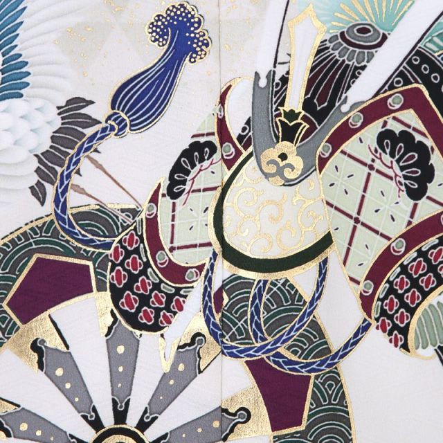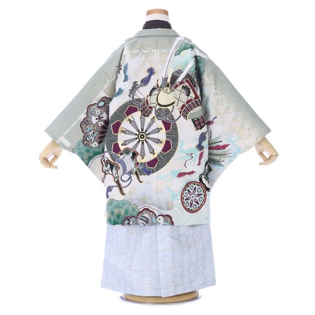 グレーがかった白地のうえに、鱗紋、波、兜、鶴、車輪、松などの伝統的な文様が繊細な筆致でたっぷりと描かれた、晴れやかな装いです。これらの文様は、いずれも縁起が良いとされる吉祥文様です。魚や蛇の鱗に見立てた鱗紋は、魔除け、厄除けの文様。波は、寄せては返す様子から、永遠や不滅を象徴する文様です。兜は、身につける人の身を守ってくれるという意味を持つと同時に、そのきらびやかな外観から権力や出世も象徴しています。古くから子どもの着物には、その文様の持つ力を授かりたいとの親心により、吉祥文様を描くことが盛んに行われてきました。このような文様が持つ意味も含めた着物文化を、次世代にも繋いでいきたいものです。着物は、黒の無地のものとし、白っぽい羽織を引き締める組み合わせにしました。大人の男性の正装のような格調高さが漂います。袴は、白に近い水色とグレーのもので、羽織の真っさらな雰囲気を活かしました。七五三は日本の伝統行事だから、装いも伝統を大切にした着物らしいものを身につけさせてあげたい、そんな親御さんにお薦めの装いです。