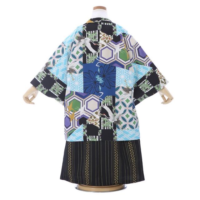 青系の色を基調とした裂取り文様の羽織が目をひく装いです。裂取り文様とは、パッチワークのように様々な裂(きれ)を繋げた文様のことをいいます。沢山の文様を欲張りに楽しめますね。そして、沢山の文様が描かれているということは、それぞれの文様の縁起の良さも積み重ねられて、目にも気持ちにも嬉しい裂取り文様です。こちらの羽織の裂取り文様は、七宝、亀甲、麻の葉の続き文様と鶴といった、縁起の良い文様が集められています。七宝は7つの宝物を、亀甲は長寿の象徴である亀の甲羅を、表しています。麻の葉文様は、麻の葉が丈夫にすくすく育つ様子から、子どもの着物の定番。そして鶴は、亀と並ぶ長寿の象徴です。着物は真っ白のものを選び、青系統の羽織との組み合わせがすっきり爽やかです。袴は、全体を引き締める、黒と黄土色のものを合わせました。羽織袴姿はそれだけで充分凜々しいから、デザインは穏やかなものを選んでみるのも良いですね。数々の吉祥文様にお坊ちゃんの将来への願いを託して、はれの日をお迎えください。