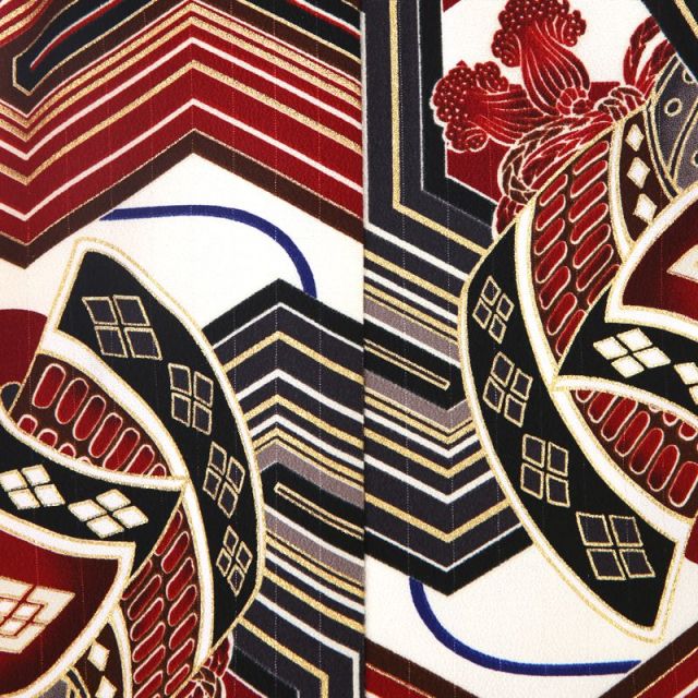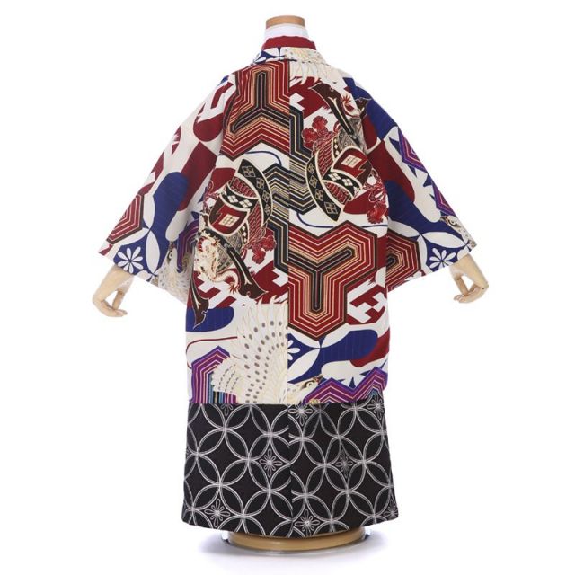 鞍、鷹、毘沙門亀甲(びしゃもんきっこう)といった勇ましく男の子らしい文様が描かれた、華やかな羽織が印象的な装いです。乗馬に欠かせない鞍は、兜や鎧と並んで武士にちなんだ文様。装飾的でもあるため、勇ましさに加え、豊かさや権力を象徴する品でもあります。鷹は姿が雄々しいだけでなく、とても賢い鳥であることからも、武家の男子が好んできた文様です。六角形を3つ繋げた幾何学文様は、毘沙門亀甲といいます。毘沙門天が身につけている装束や甲冑によく見られる文様です。吉祥文様である亀甲文様が繋がっているうえに、毘沙門天は財を象徴する七福神ですので、縁起の良さもなおさらです。多色遣いながら白ベースの上に落ち着きのある色味ばかりを使っていますので、華やかでありながらすっきりした印象も感じさせますね。着物は赤、袴は黒ベースと、いずれも羽織の柄にある色のものを合わせ、あくまで羽織の華やかさを活かしました。初めての着物姿に相応しい華のある装いで、七五三をお祝いください。