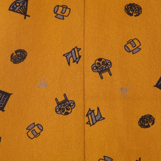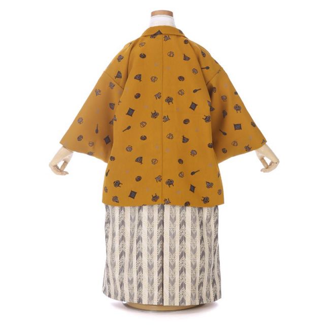 日本の色名でいうと深黄(ふかきき)や小麦色が近いでしょうか、七五三の羽織としてはあまり多くはない色合いです。そんな地色の上に打ち出の小槌、凧、扇などの柄を散りばめた、気張らない装いです。実った稲や麦の穂を思わせるような、茶色がかった黄色。原色も多い七五三の着物の中では一見地味に思えるかも知れませんが、実は力強い色味です。豊かな実りを思わせる色は、昔から縁起が良いとされてきた色でもあります。描かれ散りばめられた柄は、打ち出の小槌、凧、扇といったおめでたい柄。打ち出の小槌は言わずもがな、凧は空高く上がっていく姿が、扇は末広がりのその形が、縁起物とされています。手描き風のタッチも、柄の控えめなサイズとあいまって、とても可愛らしい雰囲気です。いかにも晴れ着といった雰囲気ではありませんが、この気張らない色と柄が何とも愛らしく、まだあどけない3歳の七五三に、楽しく和やかな雰囲気を漂わせます。あくまでも記念の日の装いであるため、白の着物と縦のラインが雰囲気を引き締める袴を合わせ、くだけすぎないコーディネートとしました。お子さんの自然な可愛らしさを引き出したい、そんなご希望の親御様にお勧めの装いです。