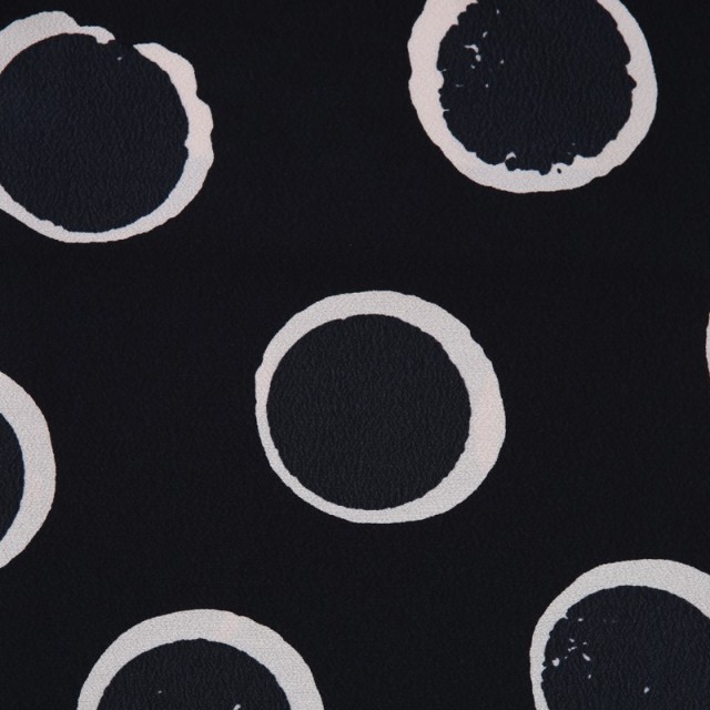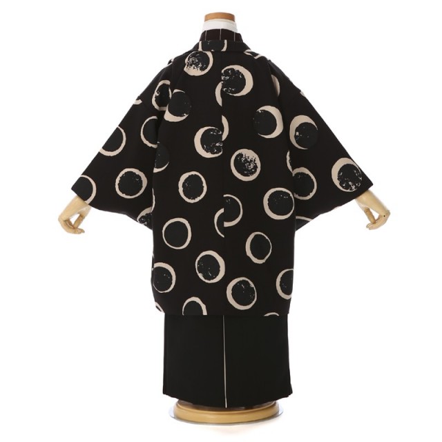 黒色地にラフな丸模様を散らした、遊び心のあるモダンな装いです。地色は黒色。そんな地色の上、全体的に、ラフなタッチの丸模様が散らされています。手描きで気負わず次々に描いたような雰囲気と、丸の中の色のところどころかすれているところが、現代アート作品のような空気を漂わせます。そんな楽しく遊び心あふれるデザインですが、この黒色が柄の持つ軽やかな雰囲気を程よく中和させ、落ち着かせています。着物と袴は、どちらも縞模様のものを合わせました。洋服の世界では、水玉と縞を合わせるというのはなかなか思いつかないことと思います。しかし、着物の世界では、柄物同士の組み合わせは珍しいことではありません。そして、曲線と直線、柄の大小というように、柄の持つ要素を違えるというのは、コーディネートのセオリーの1つです。こちらも、羽織の丸模様が大きく、曲線的な模様のため、着物と袴には直線的な縞模様を選びました。また、着物は細かな縞、袴は大きな縞とすることで、縞同士でもめりはりをつけています。洋風の場所、現代のシーンにもなじみやすい、モダンな和装をご希望の方にお薦めの装いです。