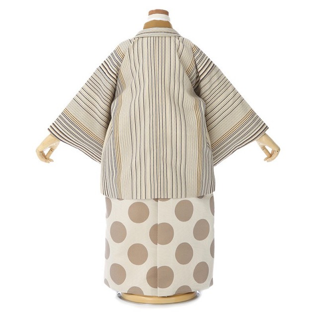 七五三は古典着物も人気ですが、どこか懐かしさを感じるレトロでお洒落な着こなしもおすすめです。羽織はストライプ柄。「滝縞文様」という、太い筋から細い筋になっている縞文様で、縞の連続が滝のように見えることから名付けられました。直線は厄除けというお守りのような意味が込められています。着物のシックな黄色は、「蘭茶」と呼び、赤みのある黄褐色のことです。江戸時代に流行した伝統色の一つです。袴には、大きな水玉柄。水玉柄は、季節を問わず通年着用することが出来る人気の文様です。古典文様を見慣れていない方もコーディネートしやすいでしょう。男の子の着物らしく、格好良くシックな色彩ですが、非常にセンスがよく粋な装いに仕上がりました。他と被りたくない、個性的で自分らしさが出るこちらの着物。大人っぽい着姿にしてくれるので、我が子の成長を感じられるのではないでしょうか。お気に入りの着物が見つかると、より想い出に残ることでしょう。
