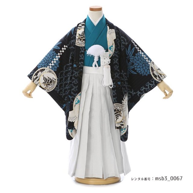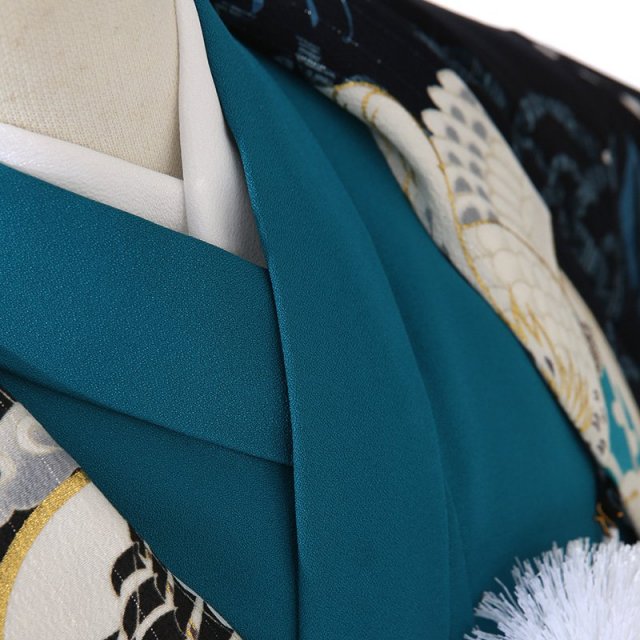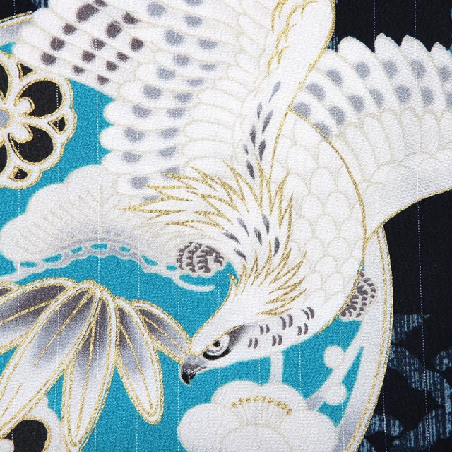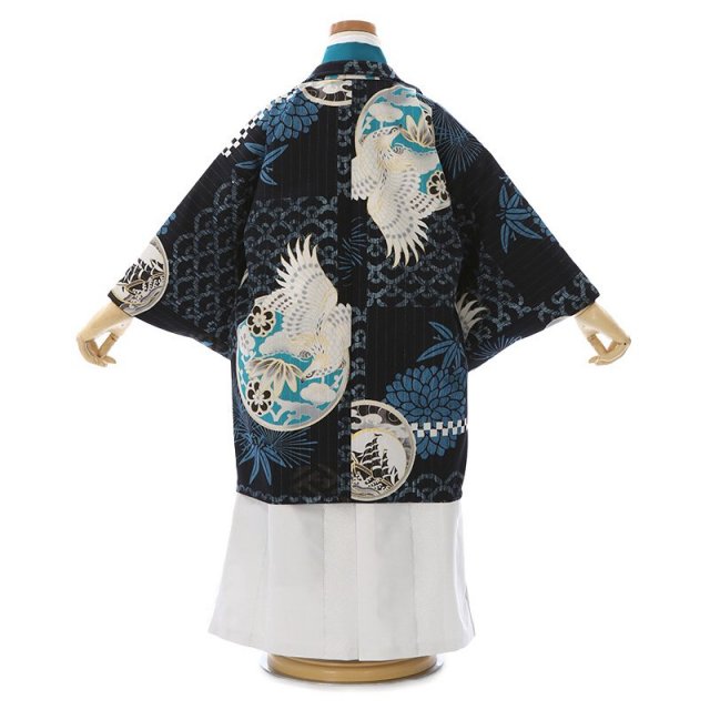 着物地は美しいピーコックグリーン。日本名では「孔雀青(くじゃくあお)」と呼ばれます。孔雀の青い羽の色のような冴えた青色で、孔雀の羽や首の部分に見られる美しい青に由来しており、ほんのり緑みを帯びている非常に綺麗な色が使用されています。そして「黒色」の羽織には文様が浮かび上がるように華やかに描かれます。大空と飛ぶ「鷹」は、逞しさ神々しさを感じさせます。そして、遠くまで見渡すことが出来る鷹の目には、本質を見抜く、先を見通すという意味が込められます。また鋭い爪は、獲物を掴み離さないということから、つかんだ運や幸運を離さないという意味があります。「青海波文様」は、無限に続く穏やかな波に平和の願いが込められています。黒地に華やかでおめでたい意味が込められた文様と、男の子らしい色彩が美しく、大切なお祝いの日に相応しい装いをしていただけるでしょう。