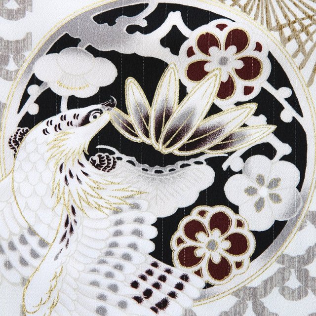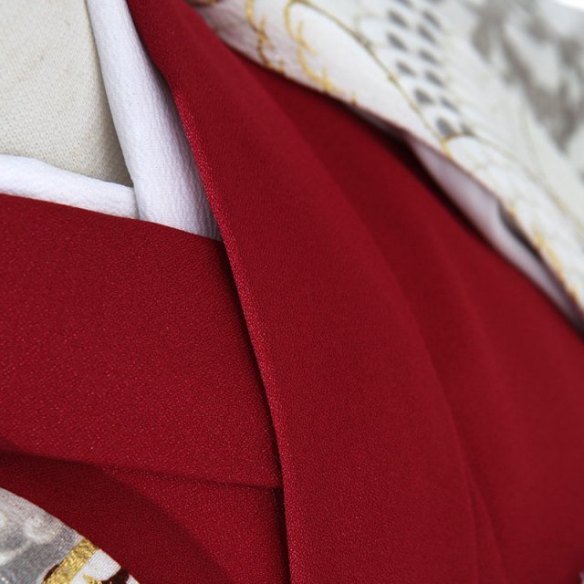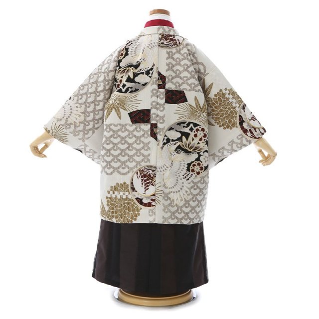 着物地は「真紅(しんく)」と呼ばれる深みのある真っ赤な紅色。古来より紅色は多くの人々を魅了した色ですが、紅花がとても高価であったため、なかなか作れませんでした。真紅という名前は混ざり物がない、正真正銘の紅花による染め色であることが強調された色名となっており、赤の中でも高級感があります。そして袴の深みのある茶色は「吉岡染(よしおかぞめ)」。暗い黒茶色で、個人の名前を冠した最も古い例であり、江戸前期に流行しました。羽織は、白色におめでたい吉祥文様が沢山描かれています。大空と飛ぶ「鷹」は、逞しさ神々しさを感じさせます。そして、遠くまで見渡すことが出来る鷹の目には、本質を見抜く、先を見通すという意味が込められます。また鋭い爪は、獲物を掴み離さないということから、つかんだ運や幸運を離さないという意味があります。「青海波文様」は、無限に続く穏やかな波に平和の願いが込められています。男の子のお祝いに相応しい文様ばかりで非常に豪華。使用される色彩も美しく、大切なシーンに相応しい装いになっております。