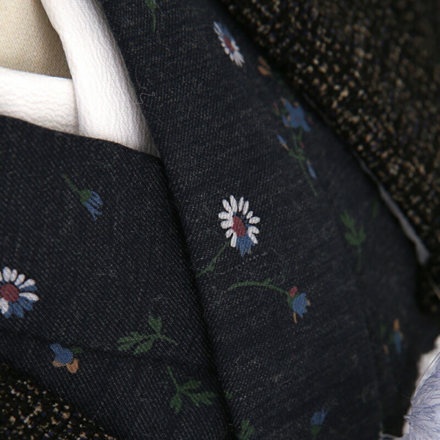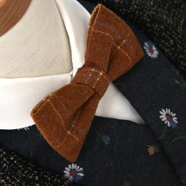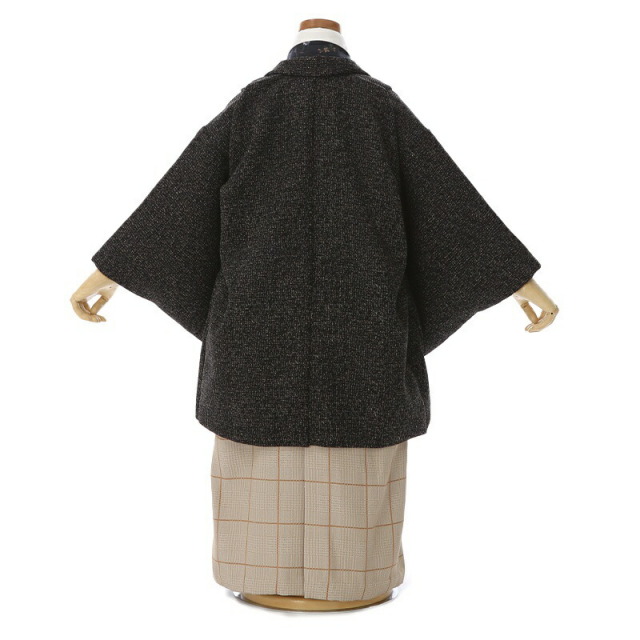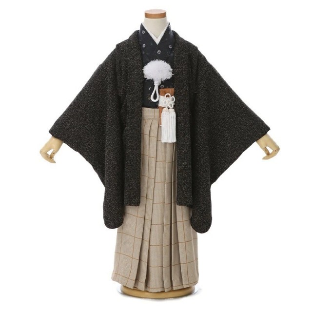 全体的にシックな色使いで落ち着いた雰囲気のある着物ですが、細かいこだわりポイントが沢山あるこちらの装い。着物には、小花が描かれます。お花の文様は男の子着物には珍しいですが、さりげなく描くことでとても可愛らしく上品に仕上がっています。そこに、ツイード生地の羽織と蝶ネクタイを合わせました。袴のベージュカラーは「利休白茶(りきゅうしらちゃ)」と呼ばれる伝統色。 わび茶道の祖「千利休」 をイメージさせる上品で穏やかな白茶色です。レトロな雰囲気と今っぽい雰囲気、どちらも取り入れておりバランスの良さを感じます。こだわりがある方に是非おすすめしたいお洒落な一着です。