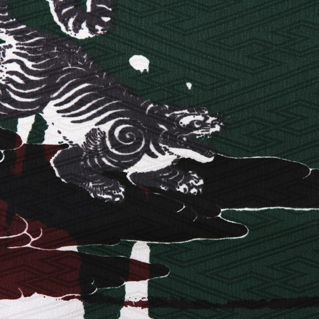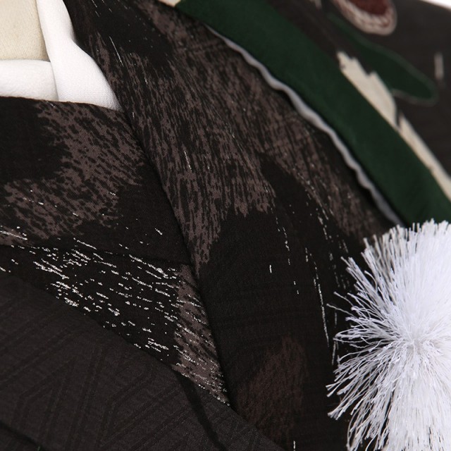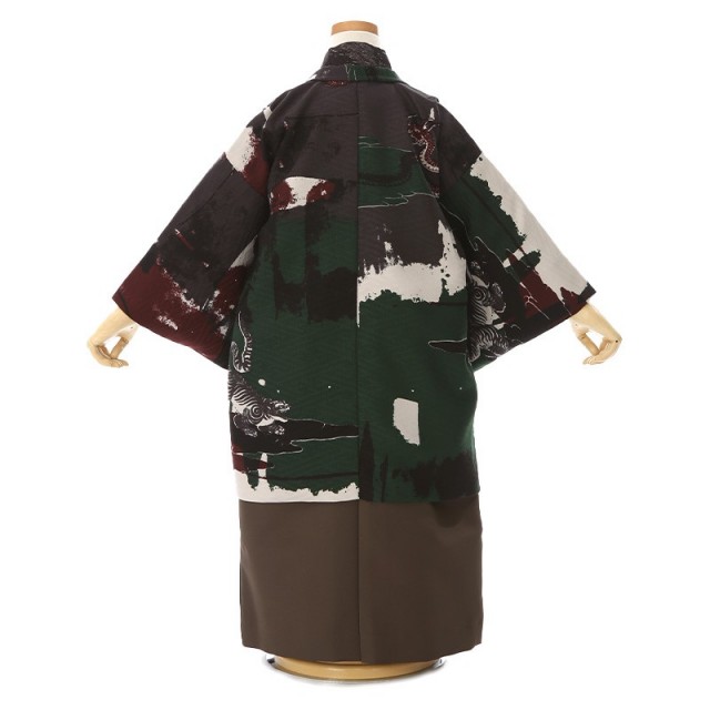 落ち着きのある男の子らしい色味と、古典的な文様がお洒落に描かれたレトロモダンスタイルのお祝い着です。袴の赤みがかった黒茶色は「吉岡染(よしおかぞめ)」と呼ばれる伝統色が使用されており、深みのある上品なカラーを組み合わせることで、格調の高さを感じます。そして羽織に描かれる文様は力強い「龍」。龍は、神聖なる霊獣として尊ばれ、権力を手にした皇帝を象徴するシンボルとなり、さまざまな装飾に用いられ、強い力の象徴として好まれてきました。また、日本では水を司る神として、人々の信仰を深めたとされています。「虎」は、古墳時代から墳墓や鏡に描かれてきました。桃山時代以後は猛々しい姿が好まれ、屏風などによく用いられた文様です。男の子らしく凛とした印象のこちらの着物。古典さとお洒落さが組み合わさった特別な一着です。