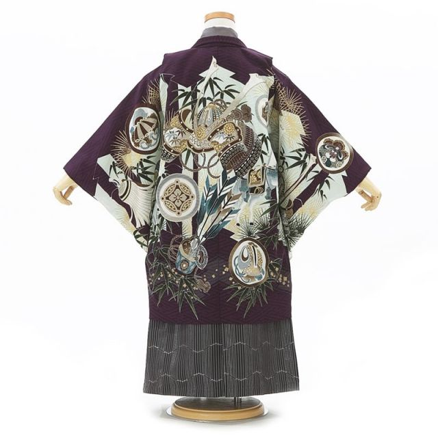 古典柄にこだわりながらオリジナリティ溢れる着物を製作している乙葉より、渋い紫が印象的なお着物。男の子の着物で紫のイメージはあまりないかもしれませんが、こちらのお着物の濃紫はクールさと渋さすら感じます。紫は日本古来より高貴な色として大切にされてきました。なんと、聖徳太子の時代から位の高い官僚に与えられていたんです!どれだけ歴史が長いかよく分かりますね。羽織の背面には大きく「兜」が描かれています。七五三のお着物で大人気の兜ですが、邪気を払い、男の子の成長を守ってくれる存在で、長く伸びた前立ては権威の象徴です。戦国時代では男性の象徴とも言えるアイテムですが、現代でも勇ましく育って欲しいという願いを込めて大切にされています。そのほかにも円で囲まれた文様は「宝尽くし」と呼ばれ、縁起の良いと言われる宝物がそれぞれに描かれています。打ち出の小槌、巻物、七宝、宝袋など・・・ひとつひとつ見ていくと発見があります!その他にも男の子を象徴する文様と縁起の良い文様が敷き詰められた、幸せいっぱいのお着物です。