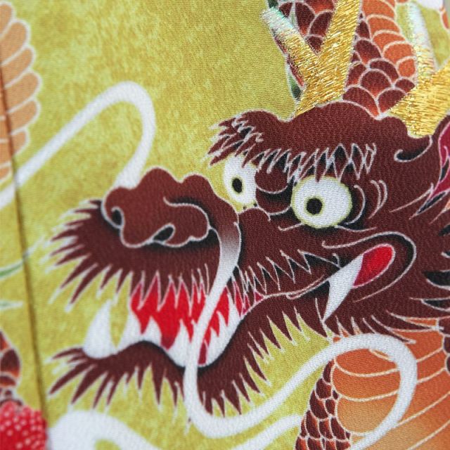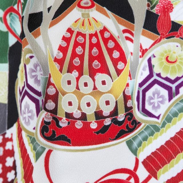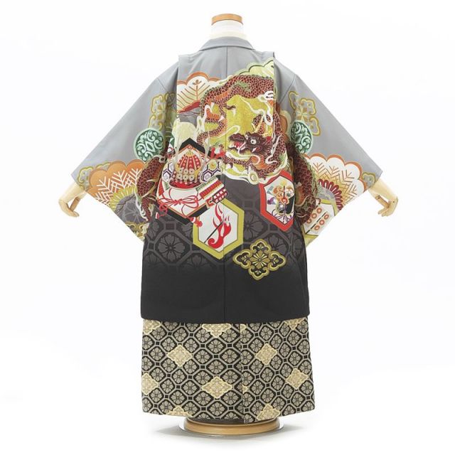 花菱紋にグラデーションの袴と豪華な文様の羽織が素敵なコーディネート。背面には赤い兜が描かれています。日本史に詳しい方ならまず目につくであろう、額の六文銭に鹿のような大きな角。これは戦国武将 真田幸村が使っていた兜のデザインなんです。軍の甲冑や戦の道具を赤に揃えるなど、おしゃれな武将としても有名で、その生き様から人気のある人物です。そんな真田幸村の兜からは強さと諦めない心を感じることができます。背面には兜・軍配・槍・炎も描かれ、まさに武士のようにたくましく強く育って欲しいという願いが込められているかっこいいデザインになっています。そして、着物の前後に力強く天を泳いでいる赤い龍がいますね。龍は想像上の生き物ですが、その力強い姿から男の子を象徴する文様として古くから用いられています。戦国武将と龍という「強さ」と「たくましさ」を表す文様を使って、男の子の成長を願う気持ちを表してくれています。