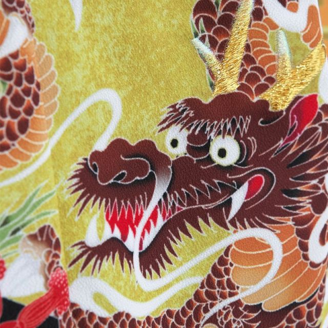 オレンジから臙脂へのグラデーションがおしゃれなこちらのお着物には、力強さを感じさせる「龍」・「武将の道具」が描かれています。縁起物「松」も全体を華やかに仕上げてくれて、お祝いの喜びが全面に溢れたお着物です!七五三のお着物には「龍」や「兜」が描かれていることが多いのはご存知でしょうか?なぜ?と思われる方も多いと思いますが、その2つには「強さ」「出世・飛躍」の意味が込められているんです。そのため、古くより日本ではこれらの文様を着物にあしらい、男の子の健やかな健康と将来の活躍を祈っていました。「龍」は神獣と信じられ、ギョロッとした力強い瞳と瞳天を泳ぐ姿がたくましく、人生の飛躍を感じさせることから男の子を象徴する柄として親しまれてきました。「兜」は武士の象徴であることに加え、災や疫病から男の子を守る厄除けのような存在。どちらも元気な成長を願う際には、なくてはならない文様でした。こちらのお着物には、それ以外にも武士を思わせる軍配や槍が描かれています。古典的な文様は意味を知るとまた見方が変わってきますよね。お子さんの健やかでたくましい成長を願って、選んでみてはいかがでしょうか。