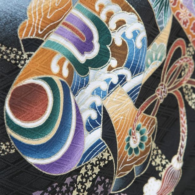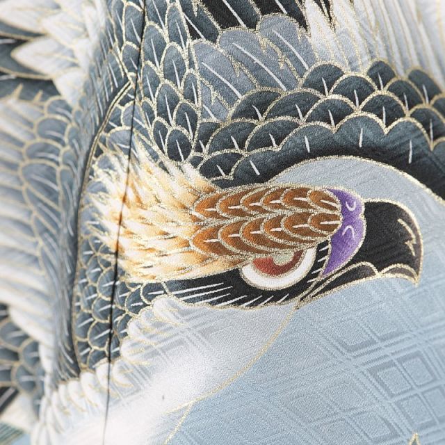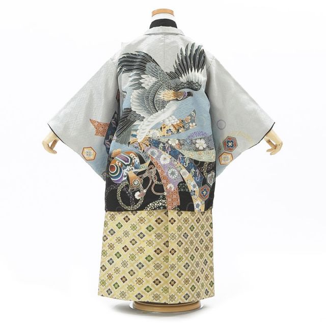5歳の男の子のお祝い着は、お着物、袴、羽織が欠かせません。女の子の場合はお着物をかわいらしく華やかにデザインしますが、男の子のお着物はシンプルです。袴をはき、羽織を羽織るとお着物の見える部分は少なくなりますが、こちらのセットではお着物は黒できりりときめています。お着物をシンプルにしているかわりに、袴と羽織でおしゃれ感やかっこよさを出します。こちらの袴は菱形がつながった柄が使われています。緑や青の落ち着いた色の小さな菱形と、それを囲むゴールドのラインが品のあるデザインです。羽織は、光沢感のあるブルーグレーをベースに、下の方は黒に色づけされています。ブルーグレーのところを見ると、うっすら菱形の模様が見えると思います。これは地紋というもので、生地を折るときに模様を織り込んでいるものです。光の当たり具合で模様が浮き出るように見えるので、地紋があるとより華やかに豪華に見えます。羽織の背中側には、大空を舞う鷹と左の下の方には打ち出の小槌(こづち)。そして、鷹が爪でしっかりとつかんでいるものを束ね熨斗(のし)といいます。打ち出の小槌は昔話にも出てくるように、願いが叶うようにという意味もあるのですよ。どれも古くから使われている古典柄ですが、実はよく見ると打ち出の小槌の下の方には小さな星形で模様があしらわれています。古典調の中にも遊び心が隠されているのが魅力のデザインです。