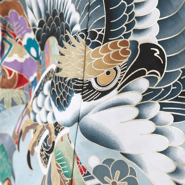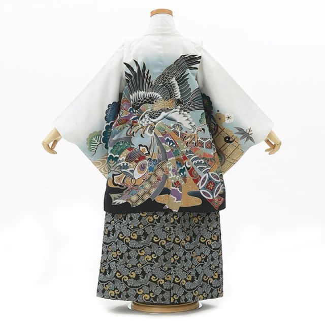 白いお着物と薄いブルーをベースとした羽織がとてもさわやかな印象です。羽織は正面から見ると、松、竹、梅が描かれていて、お祝いにふさわしいとてもおめでたいデザインです。女の子のお着物は正面から見たときに美しく見えるようにお着物をデザインしますが、男の子の羽織は背中から見たときに一番かっこよくなるようにデザインされているのが特徴。羽織の背中側には松竹梅と中央には大きな鷹、左の下の方には打ち出の小槌(こづち)、鷹の大きな爪でつかむように束ね熨斗(のし)が描かれ、こちらも縁起の良いおめでたいデザインです。鷹はお宮参りのお祝い着や七五三の羽織など、男の子のお着物のモチーフの代表的なものです。雄々しく勇猛なその姿はとても男性的ですが、鷹がよく使われてきたのは見た目のかっこよさだけではありません。大きく鋭い目は先を見通せるように、がっちりとした大きな後ろ足の爪は、運や幸せをしっかりとつかんで離さないようにという願いも込められています。袴は、黒をベース白と金の糸で複雑な模様が織りこまれています。淡い色のお着物と羽織に、黒ベースの袴がよく映えて存在感もしっかりとしたコーディネートです。