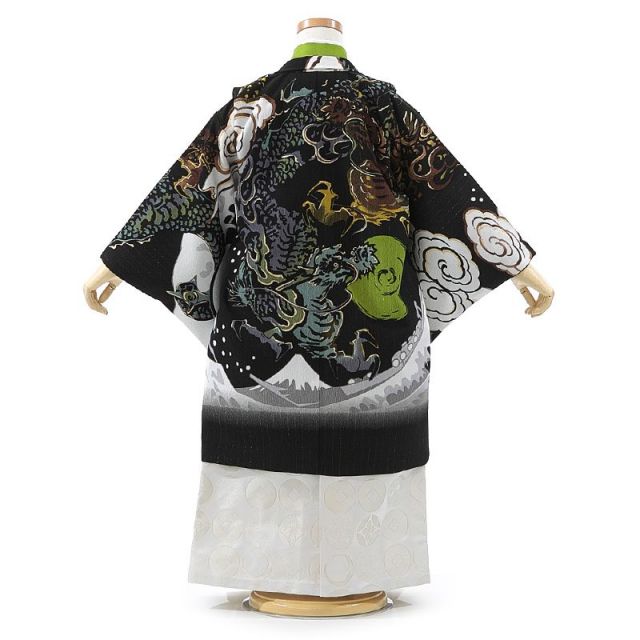モダンなデザインのこちらのお着物。古典的なかっこよさだけでなく、現代のクールを取り入れたデザインは、個性的なお着物を探している方にオススメです。背面を見ると、背中全体で物語が語られているような躍動感のある印象的な絵柄になっています。天を舞うたくましい2頭の龍。龍はたくましさと飛躍の象徴として男の子の着物によく使われる柄です。その空には大きな月、奥には富士山が見えます。海には波に揺れる船と荒々しい水しぶき、夜明けと共に新たな人生がスタートするかのような強さを感じる景色です。袖に描かれる瑞雲は「縁起がいい兆し」と言われており、絵柄全体で未来の明るさを伝えているようなかっこいいデザインです。富士山も「一富士、二鷹、三茄子」と言われるほど、縁起がいいものとして日本人にはなじみが深いものですよね。「世界で活躍するような大人になって欲しい!」という願いを込めて、他の人とは一味違う着物をぜひ着てください!