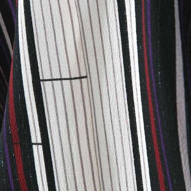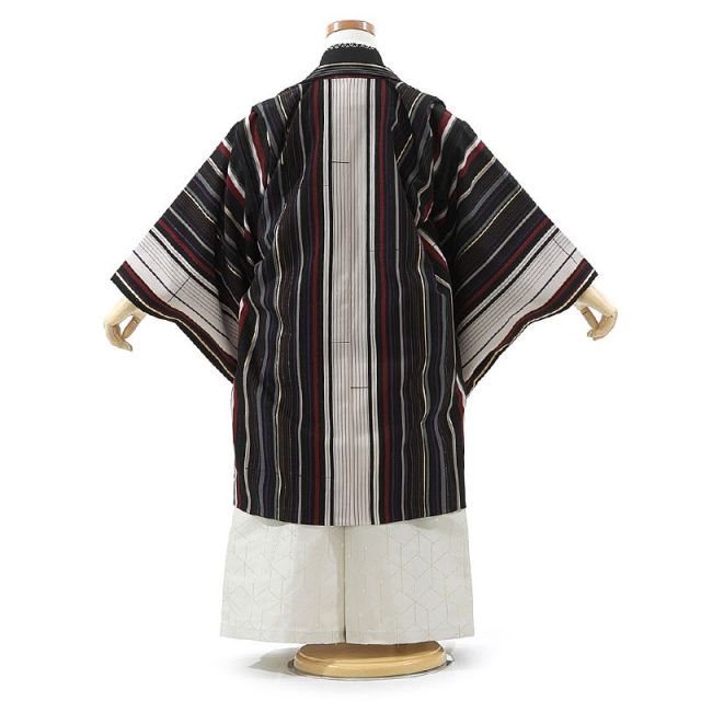 七五三の祝い着と言えば、おめでたい文様が全体に描かれていることが一般的です。しかし、こちらのお着物はシンプルな柄を組み合わせ、クールに決まっており、おしゃれなファッションが好きな男の子に着ていただきたい1着です。ストライプが印象的な羽織には、黒を基調に紫・白・赤・灰色などの太い線と細い線が組み合わせられていて、それに加え細いラメの線が効果的に入っています。おめでたい時に着る着物には金や銀をあしらうことが多いですが、こちらの羽織にはラメがその役割を果たして、全体がさりげなくキラキラして見える豪華なデザインとなっています!ただのストライプでなく、横線も入っている箇所があったり、両肩に左右ちがう柄が入っているのもユニークなポイントです。白の袴は一見、何の柄だろう?と思いますが、同系色のラインで立方体のような幾何学模様が描かれています。なかなか出会うことのない珍しい柄の袴です!このような現代的な柄を取り入れたコーディネートはいかがですか?