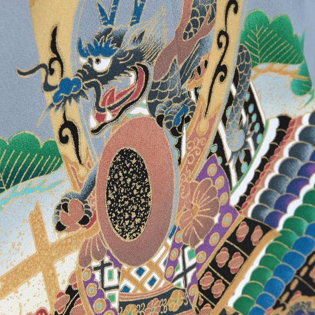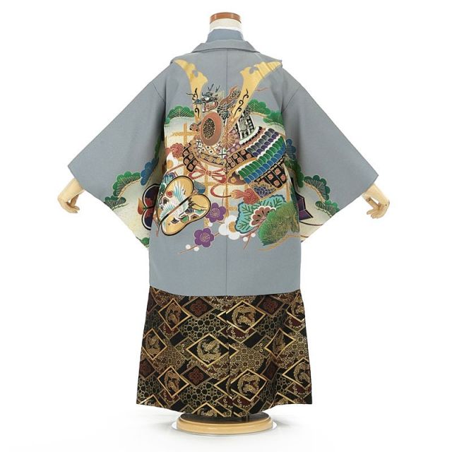 羽織と着物はシックな色味で伝統的な柄をあしらっていますが、袴がとっても豪華!黒地の袴には金色で柄が描かれており、ひし形の中には龍が描かれているという縁起の良いデザインになっています。対照的にシックな色味の羽織には、男の子の成長を祝うには完璧と言えるほど、縁起の良い文様がたくさん描かれています。背中には大きは「兜」があり、中心に乗せられた「龍」は力強く口を開いています。兜の豪華な飾りは権威を象徴し、戦国時代には武士がかぶったことから、たくましいという意味を持ちます。また、古くより災いから男の子を守ってくれるお守りでもありました。兜の周りにはおめでたい象徴の植物である「松」や「梅」が更に兜を華やかに見せてくれます。その他にも「軍配」や「小槌」など宝物を意味する、縁起のいい文様があります。軍配は勝負の采配を意味し、打ち出の小槌は願いを叶える小槌。男の子の人生において宝物が守ってくれますようにという意味が込められています。七五三という一度きりのイベントに、派手すぎず、高貴な印象のコーディネートはいかがでしょうか。