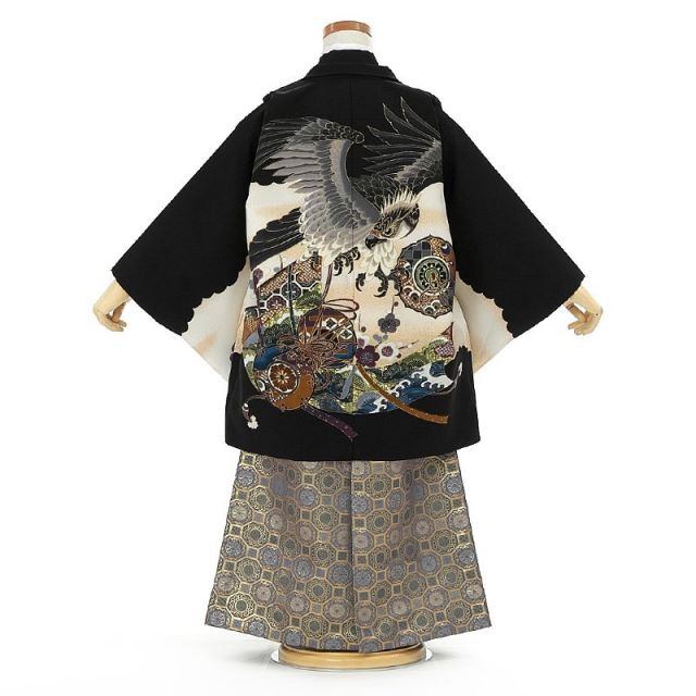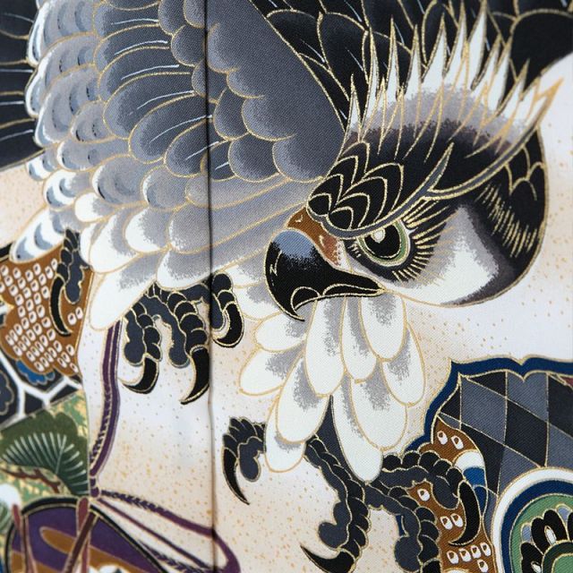羽織の背中に大きく描かれた“鷹”。鋭いまなざしの中に優しさが垣間見えます。鷹は男の子のお着物に描かれる定番の絵柄。空高く舞い上がり、広く遠くを見渡し、見つけた獲物は逃さない。その風格はまさに「大空の王者」そのものです。ですから鷹は「出世」や「権威」の象徴とされています。また鷹はその優れた視力が大きな武器。「先を見通す力」、「本質を見抜く力」を意味し、お子様にもそのような力を身に付けて欲しいという願いも込められています。鷲の下に描かれているのは“鼓(つづみ)”です。大きな音のなる楽器は「立派な実がなる」という意味にかけて「豊作」のシンボルとされています。それぞれの絵柄が大きく、ダイナミックに描かれた男の子らしさあふれる一着。男の子の強く、逞しい成長への願いが込められています。クラシックでカッコイイ晴れ姿は素敵な思い出の1ページになることでしょう。